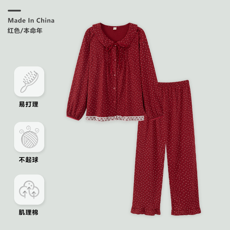 睡衣女本命年红色套装秋冬季新婚娃娃领长袖碎花长裤可外穿家居服
