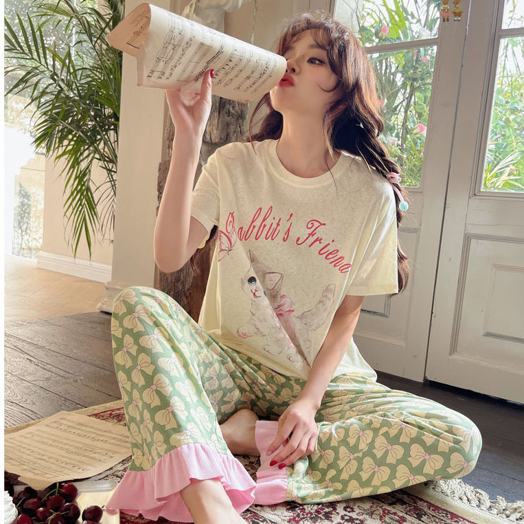 新しい綿 100% パジャマ女性の夏の綿半袖クロップドパンツプリンセススタイルかわいい春と秋のホームウェアセット