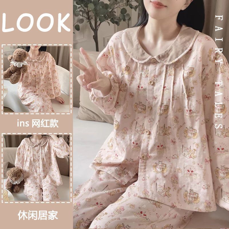 女性用純綿パジャマ、2025年春秋夏新作かわいい長袖秋冬ホーム服2点セット屋外で着用可能