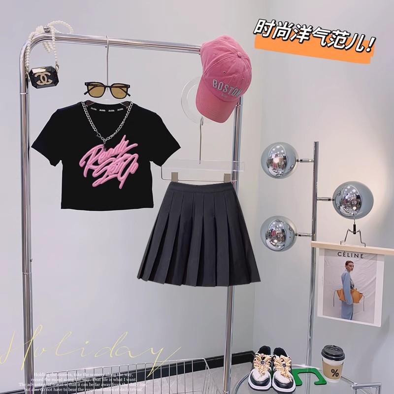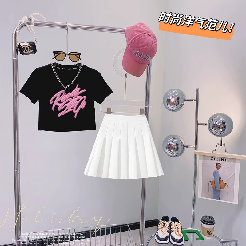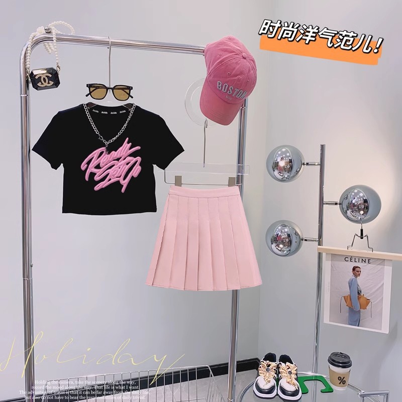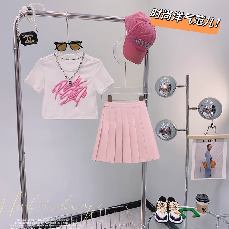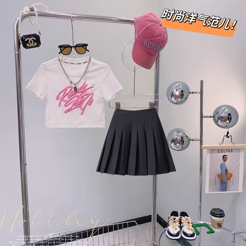 女の子サマースーツ2025新作女の子ネットセレブストリート中大型子供半袖ドーパミンウェアツーピーストレンドセット