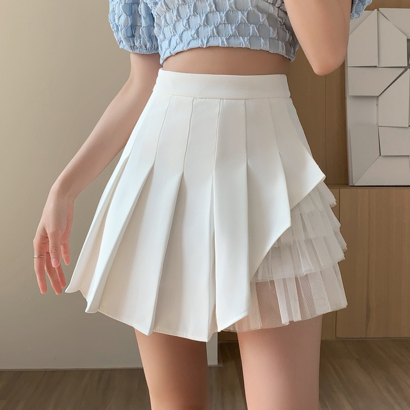 カレッジスタイルプリーツスカートスプライシングメッシュAラインスカート女性のための春と秋の甘いホットガールハイウエストスリムスカート