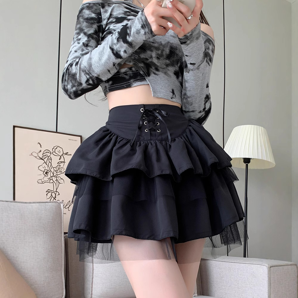 スカート レディース 春秋新作 バレエ風 ふわふわスカート ハイウエスト メッシュ 小柄 黒 レースアップ 和風 JK