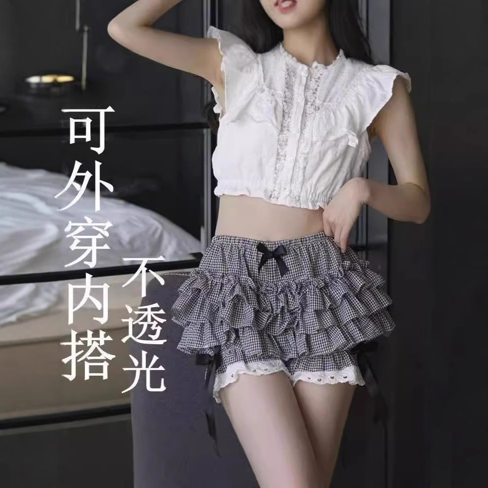 甘い千鳥格子ケーキキュロット、ハイウエスト、スリム、多層カバー、リボン付きチュチュキュロット、露出を防ぐ裏地付き