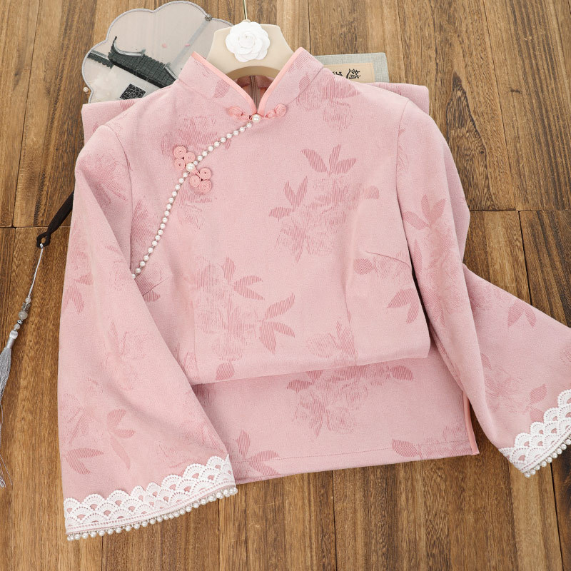 人気のある女性のピンクのスエードの女性のモデルは、大きな袖のチャイナドレスを改良しました。