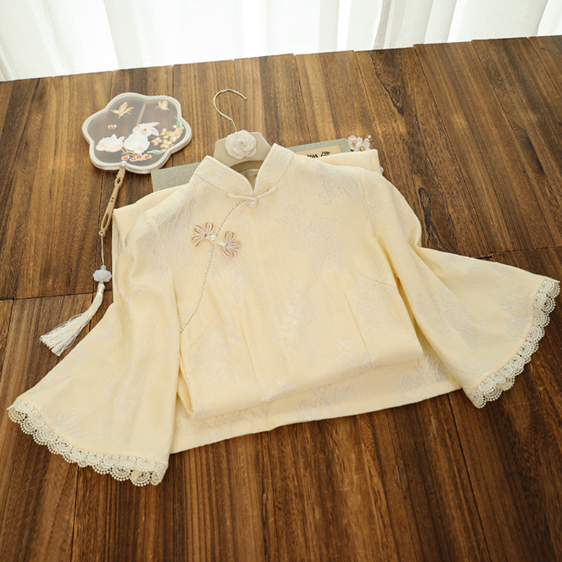 美しい娘の米の黄色のレースは大きい袖のチャイナドレスの2022年の秋の新型は復古の民国の風の気質を改良して優雅です。