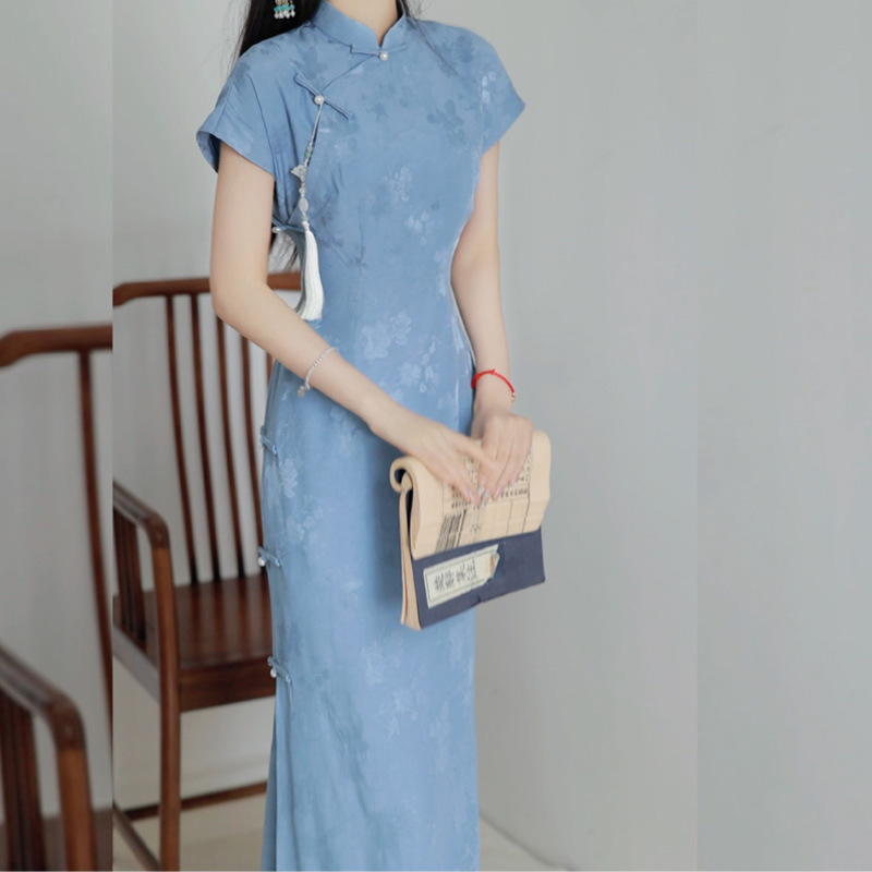 美しい娘の魚の文芸の青いジャカードの前でフォークのチャイナドレスの女性の2025年の春の新型は新しい中国式の若い金を改良します。