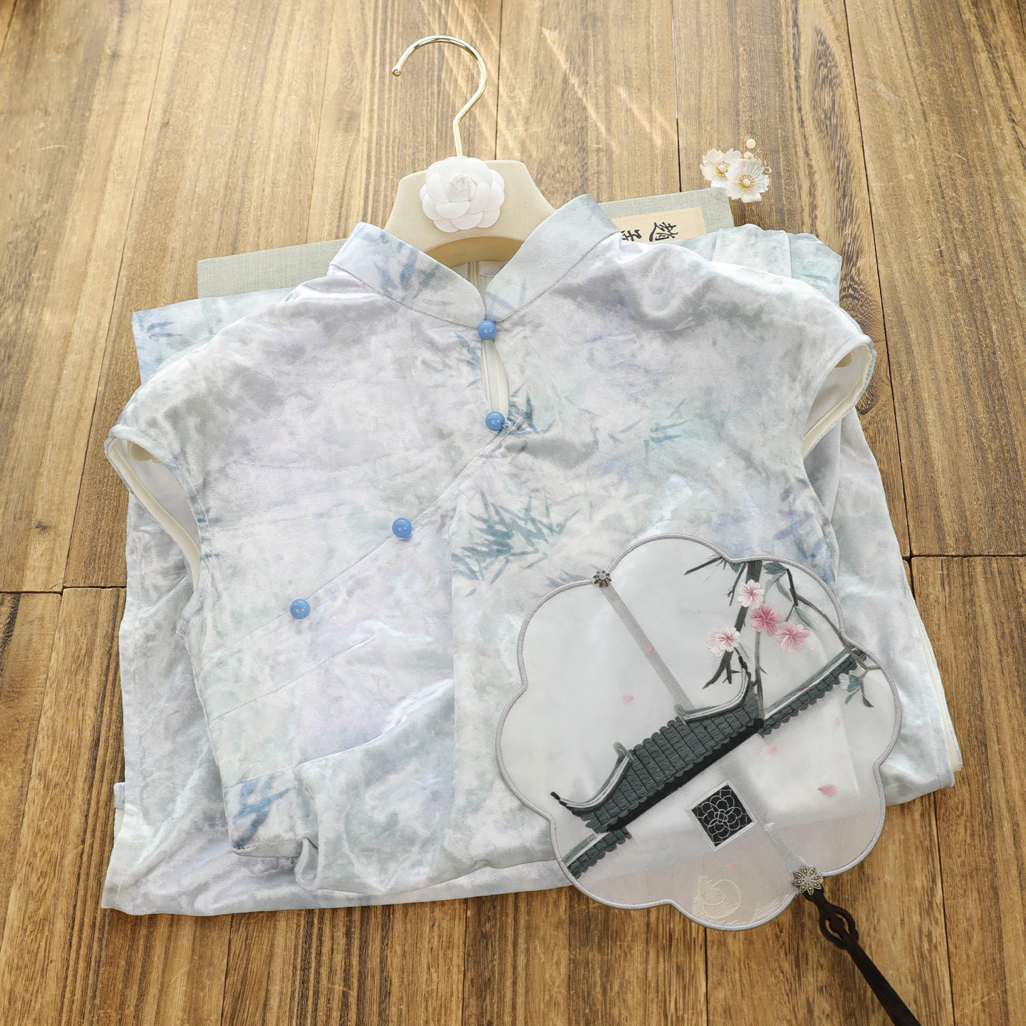 美しい娘の青い淑女の範は新しい中国式の半袖のチャイナドレスの女性の2025春夏の新型の素雅な国風の日常を改良します。