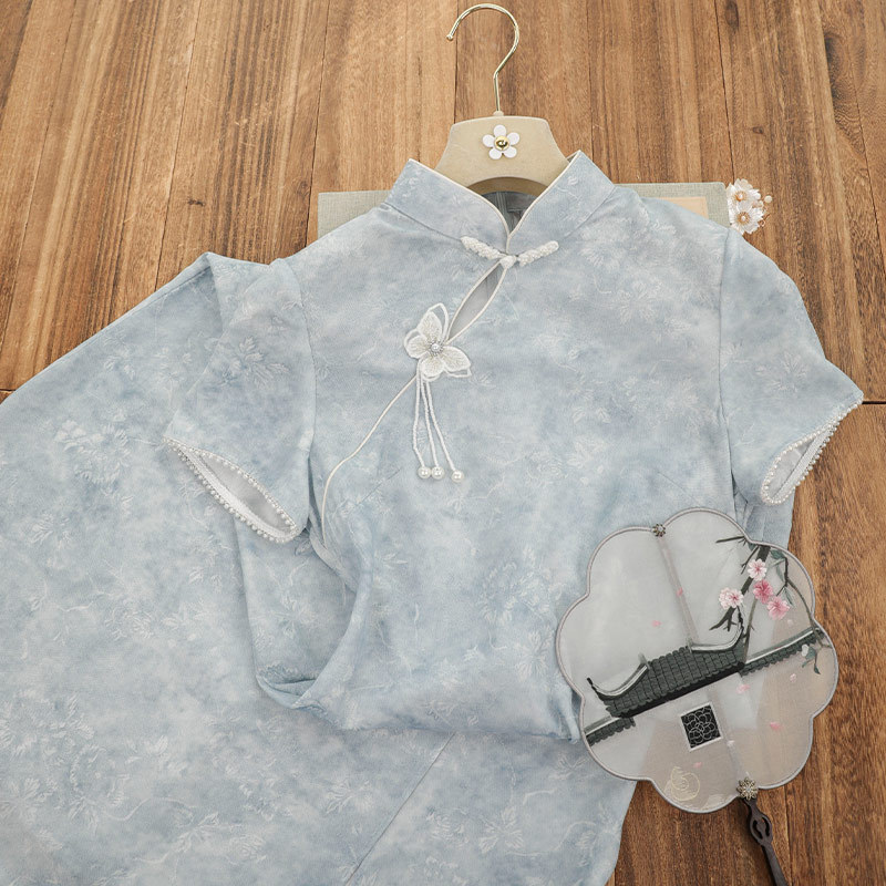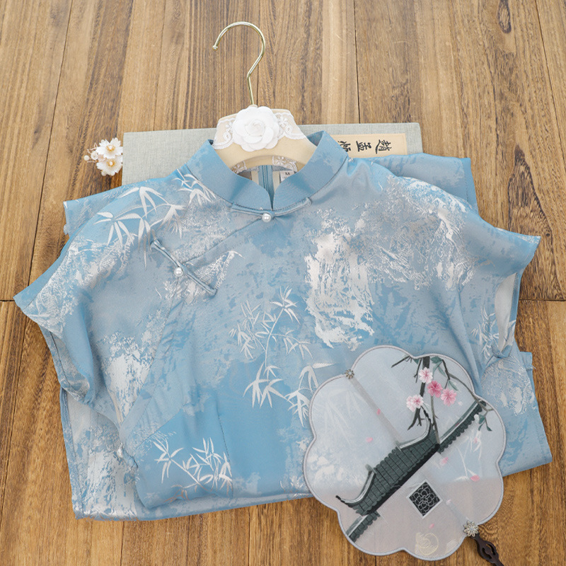 美しい娘の魚の復古民国風の青いジャカードの半袖のチャイナドレスの2024年の春夏の新型の日常は若いタイプを着ることができます。