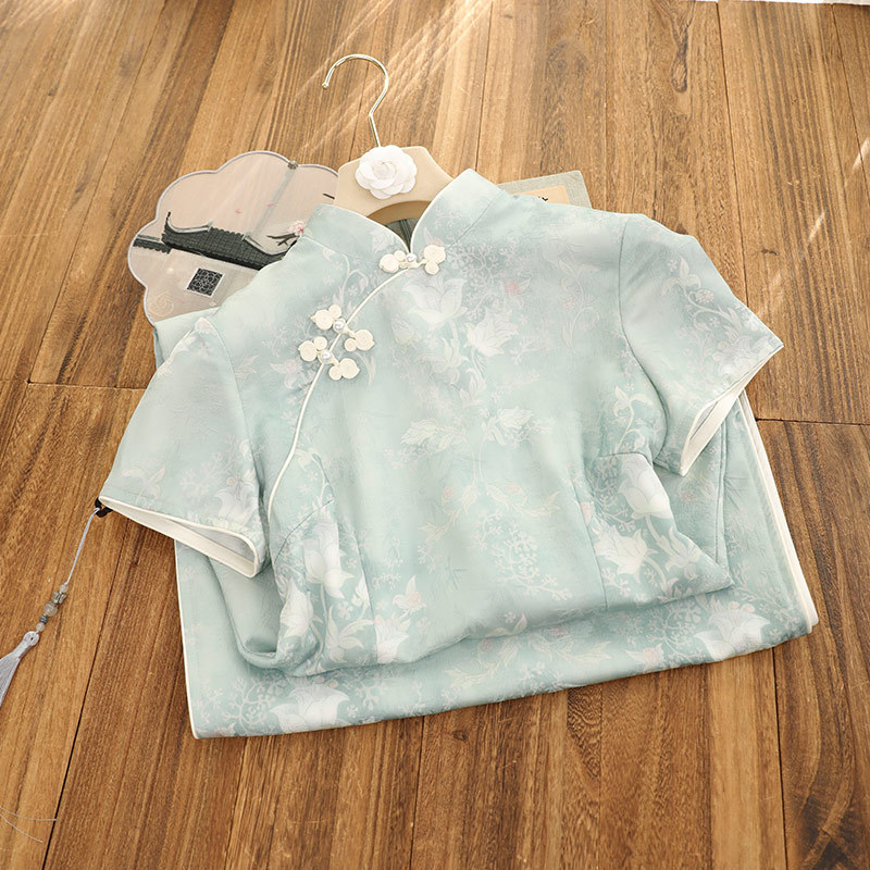美人の娘の魚の青い色の新しい中国式の復古の半袖のチャイナドレスの女性の2025年の春夏の新型のあっさりしている改良の日常は着ることができます。