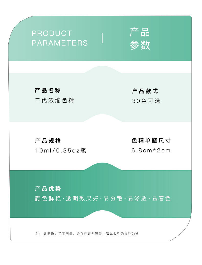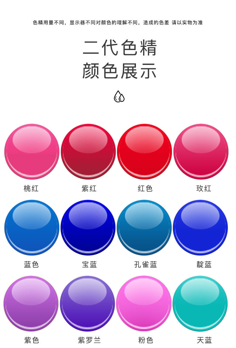 全新包装,密封尖嘴,不漏款包装30色上市了。现在二代色精升级到30色,主要色调有:大红、黄色、蓝色、绿色、粉色、橙色、宝蓝色、玫红、紫红、紫色、柠檬黄、荧光绿、金黄、白色、黑色,新增9色,紫罗兰,桃红,靛蓝,翡翠绿,咖啡色,棕色,天蓝色,草绿色,孔雀蓝,另外24色、26色的英文彩盒包装。