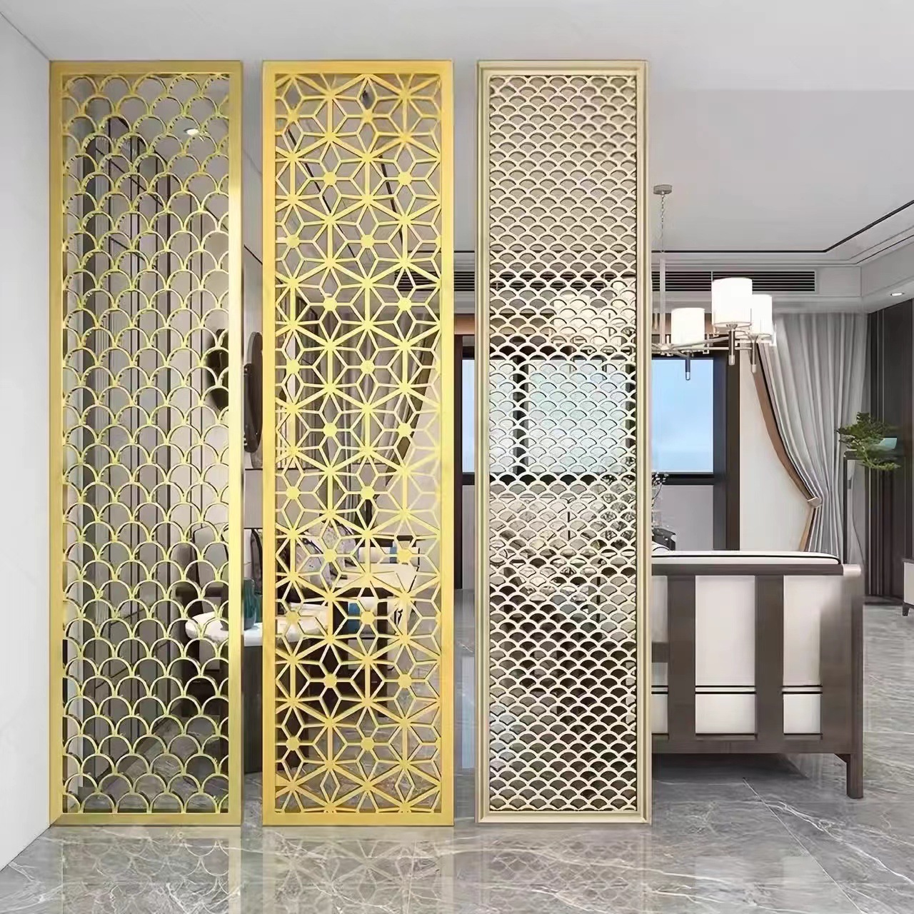 不锈钢屏风隔断激光镂空雕花格栅中式酒店玄关庭院金属背景墙