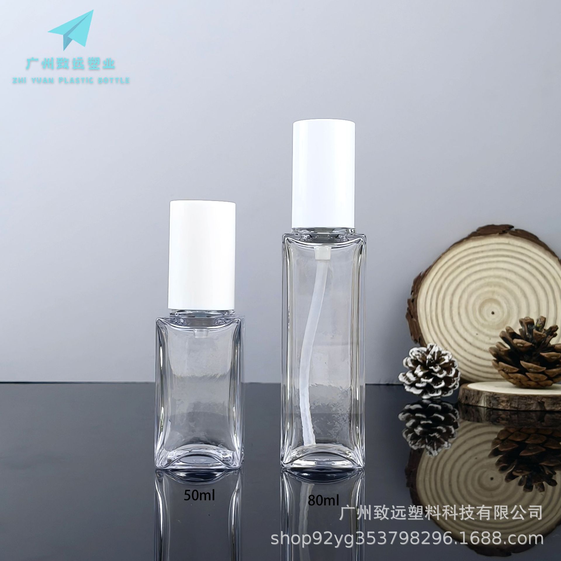 50ml厚底厚壁スクエアスプレーボトル、80mlエッセンスメイク落としヘアケアエッセンシャルオイルボトル、PET香水詰め替えボトル