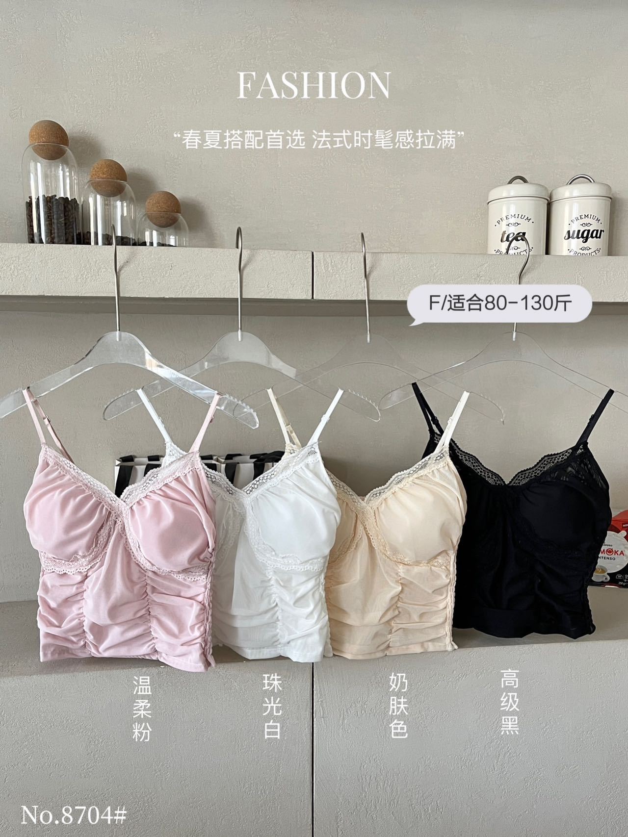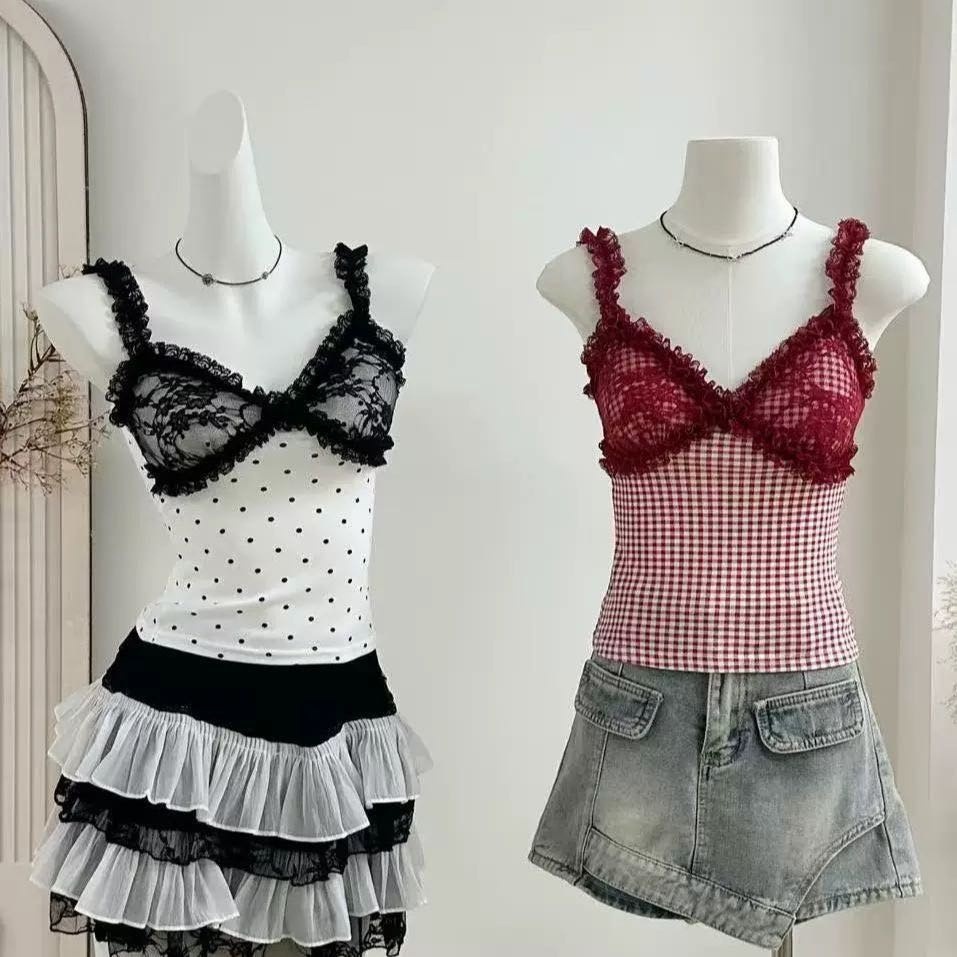 66018#蕾丝拼接带胸垫吊带背心女夏季修身显瘦甜酷辣妹短款上衣
