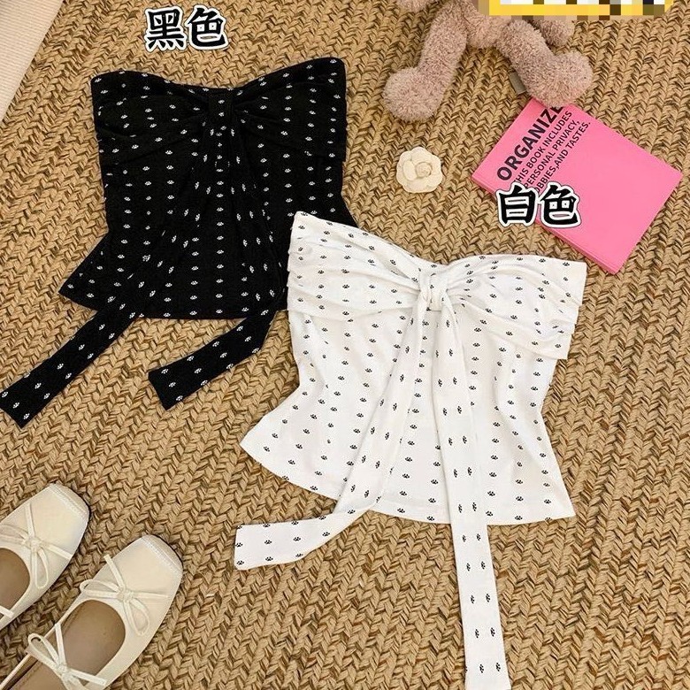 66020#夏季新款波点印花一字围辣妹蝴蝶结抹胸美背