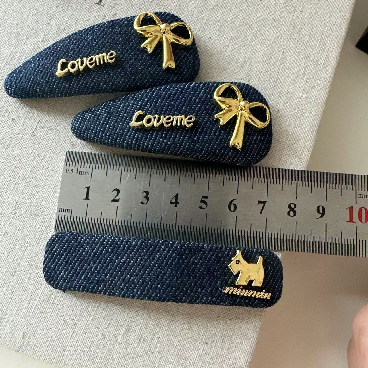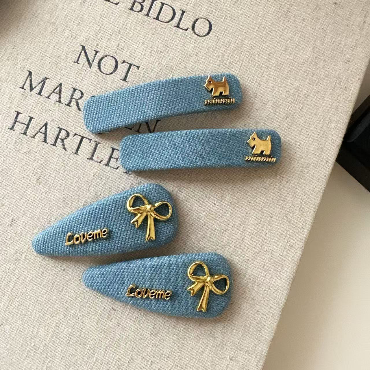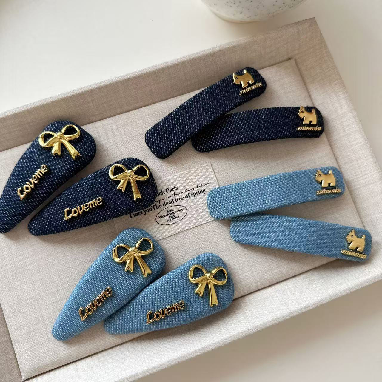 レトロデニムリボンBBヘアピンレターファブリックサイドクリップ韓国風前髪ヘアピンネットセレブヘアアクセサリー