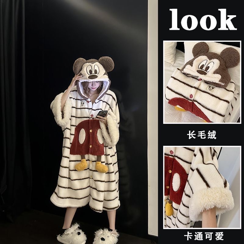 可爱卡通米奇珊瑚绒睡衣女冬季法兰绒披肩加绒加厚斗篷家居服睡袍