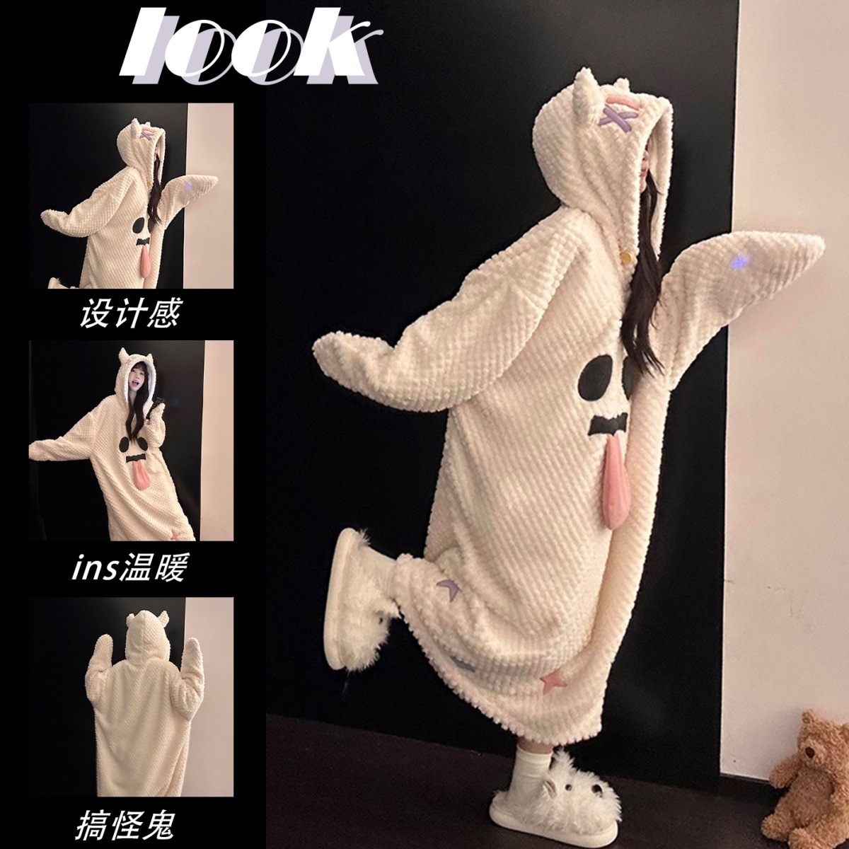 卡通搞怪鬼脸小幽灵珊瑚绒连帽睡裙女秋冬季新款加绒加厚大码睡袍