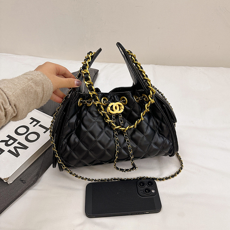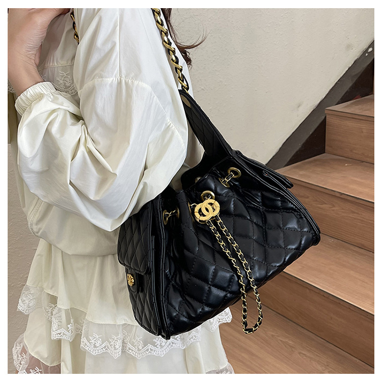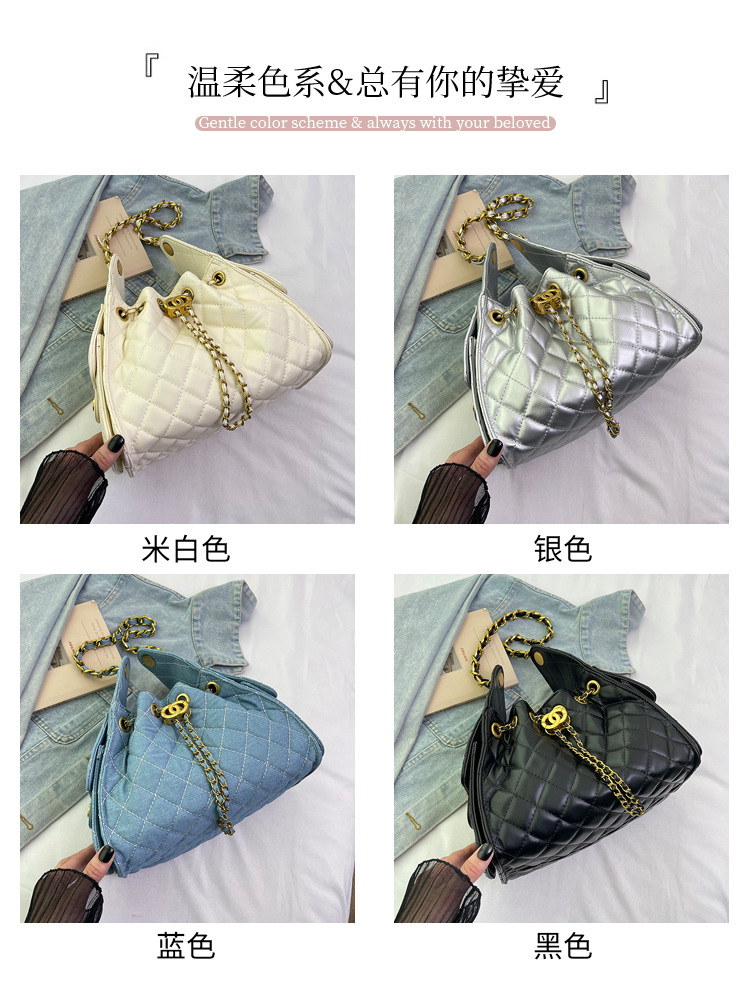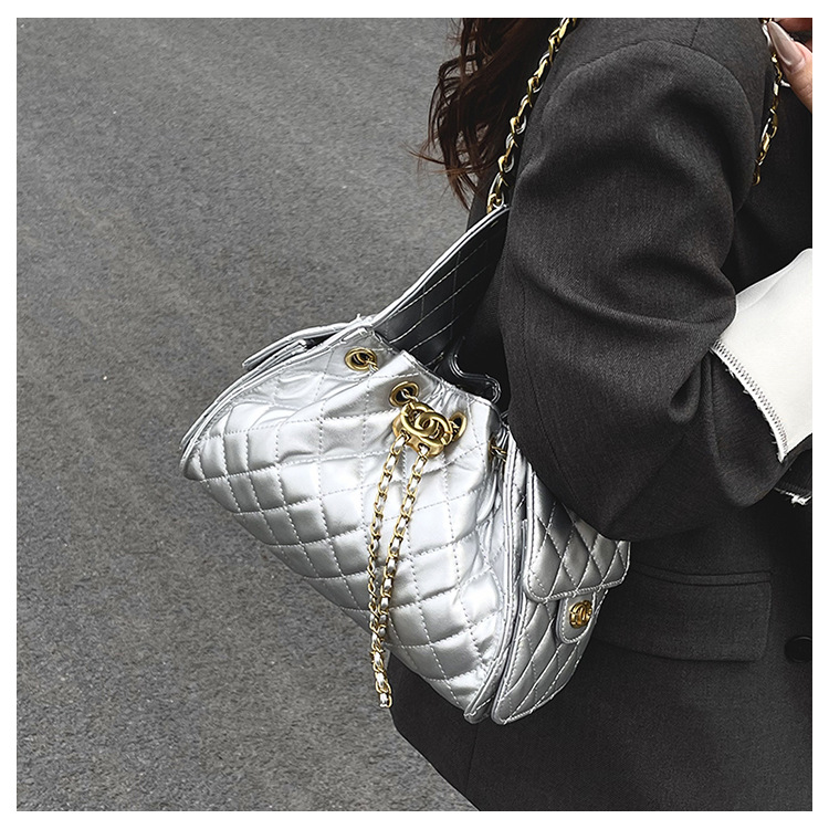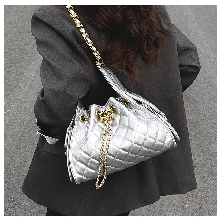 小香風シンプル菱格チェーンシングル肩バケツバッグレディース2025夏新作ショルダーバッグシルバーブラック