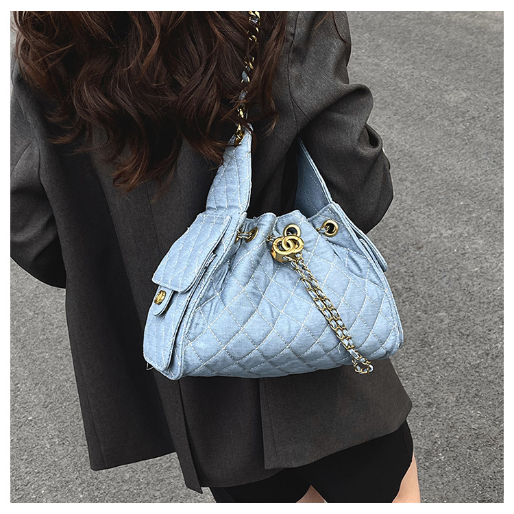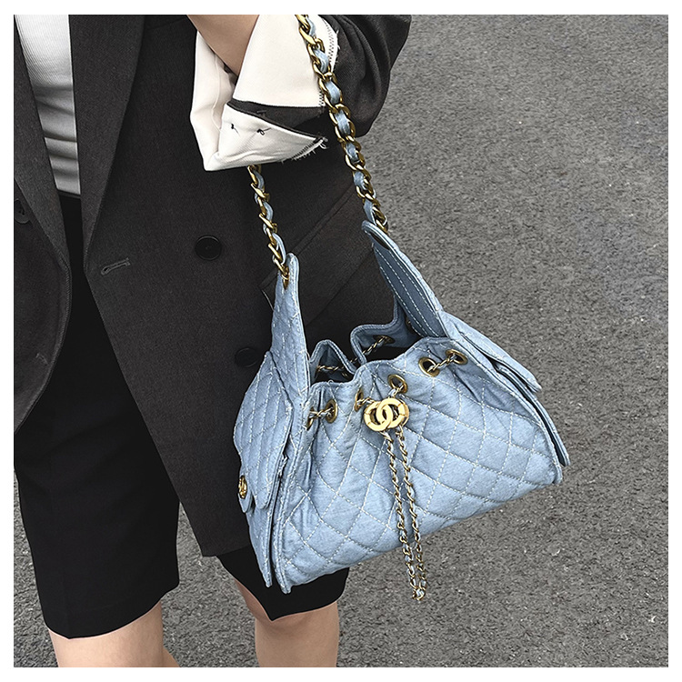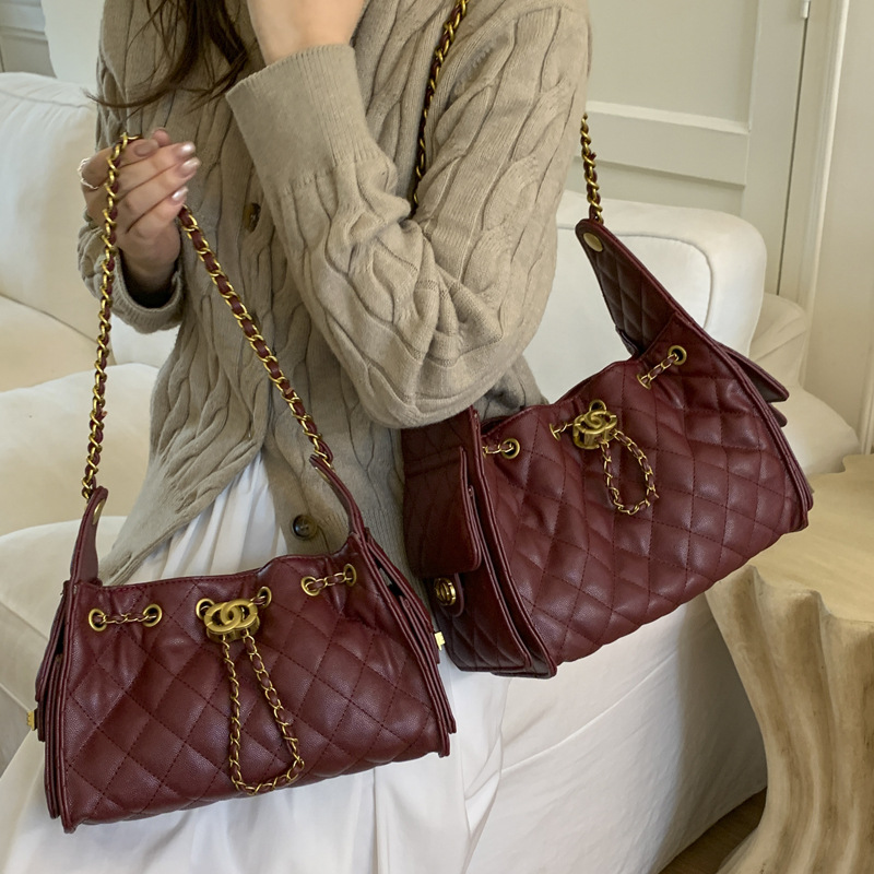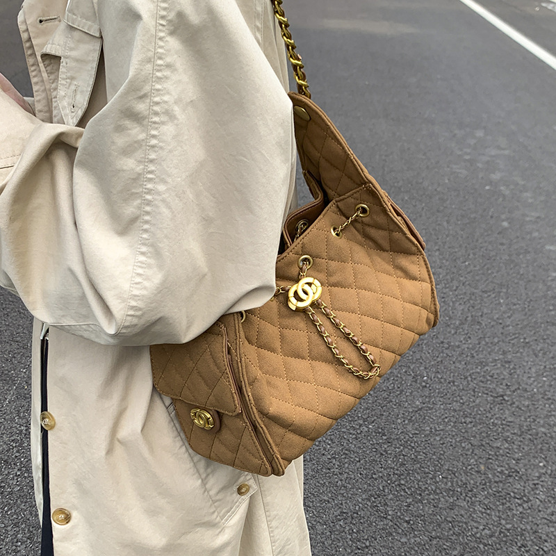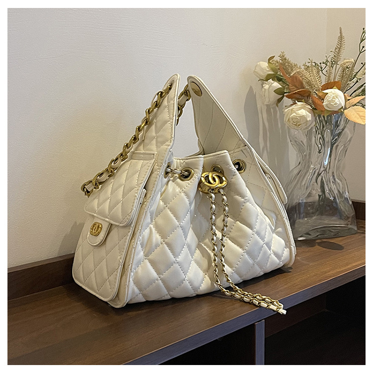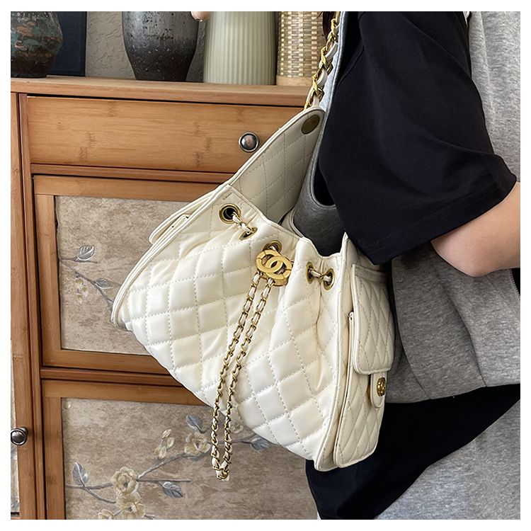 小香風シンプル菱格チェーンシングル肩バケツバッグレディース2025夏新作ショルダーバッグシルバーブラック