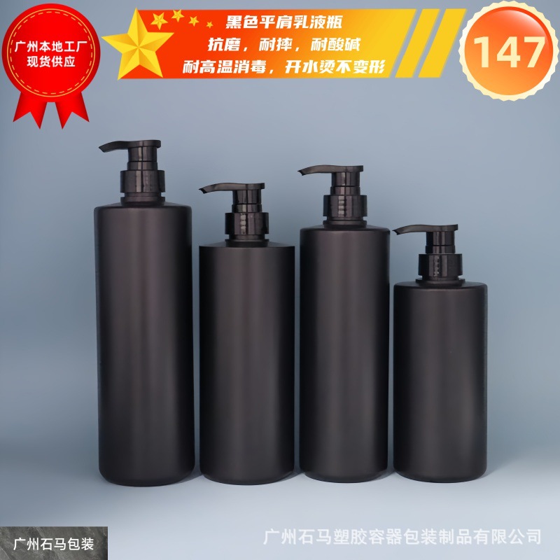黒いフラットショルダーローションポンプヘッドボトルHDPE素材ユニバーサルパッケージ在庫あり