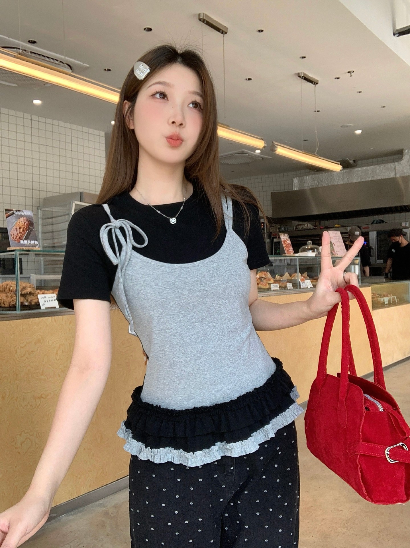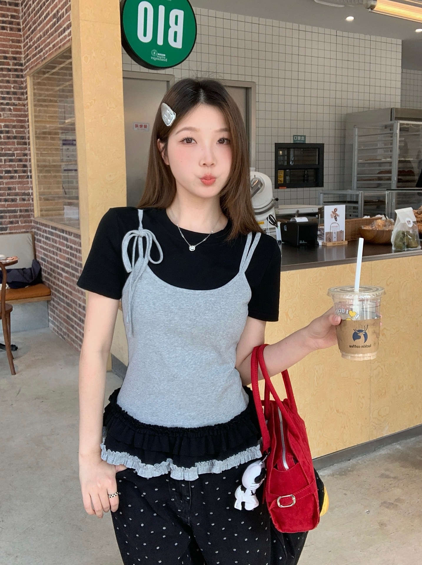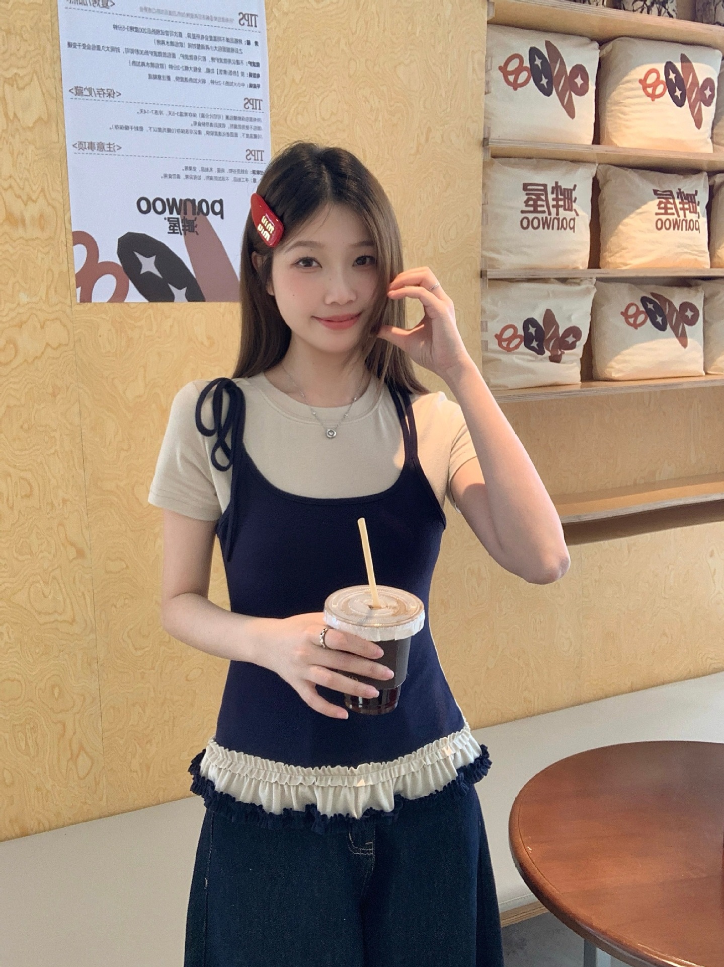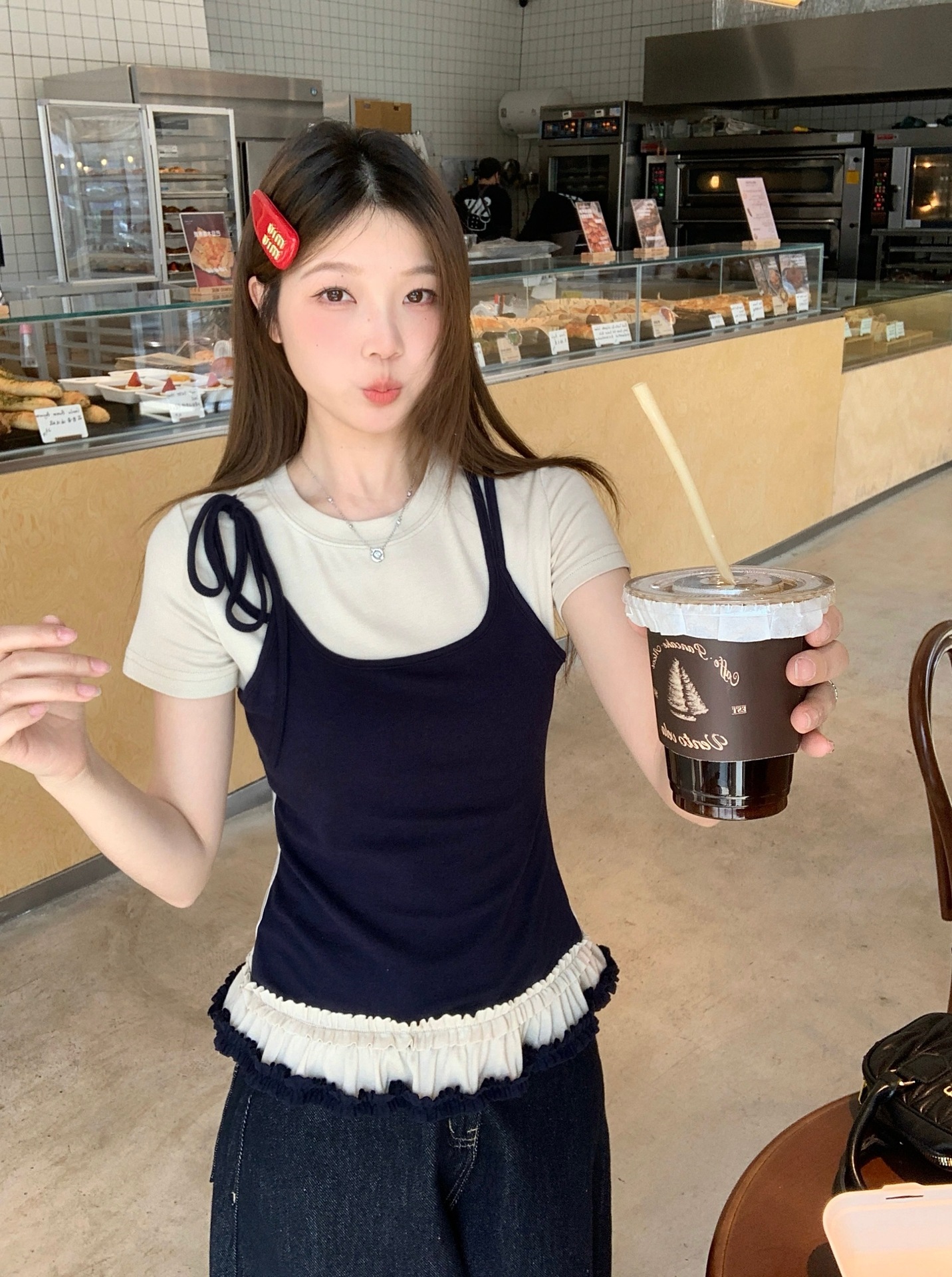 MR 【3色】韓国風フェイクツーピースサスペンダー継ぎ半袖夏甘辛ニッチ木耳トップス