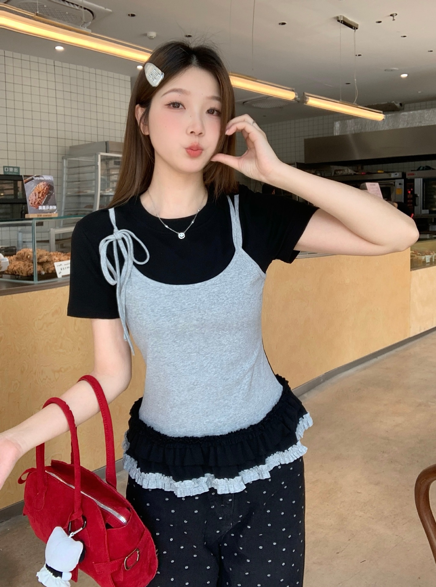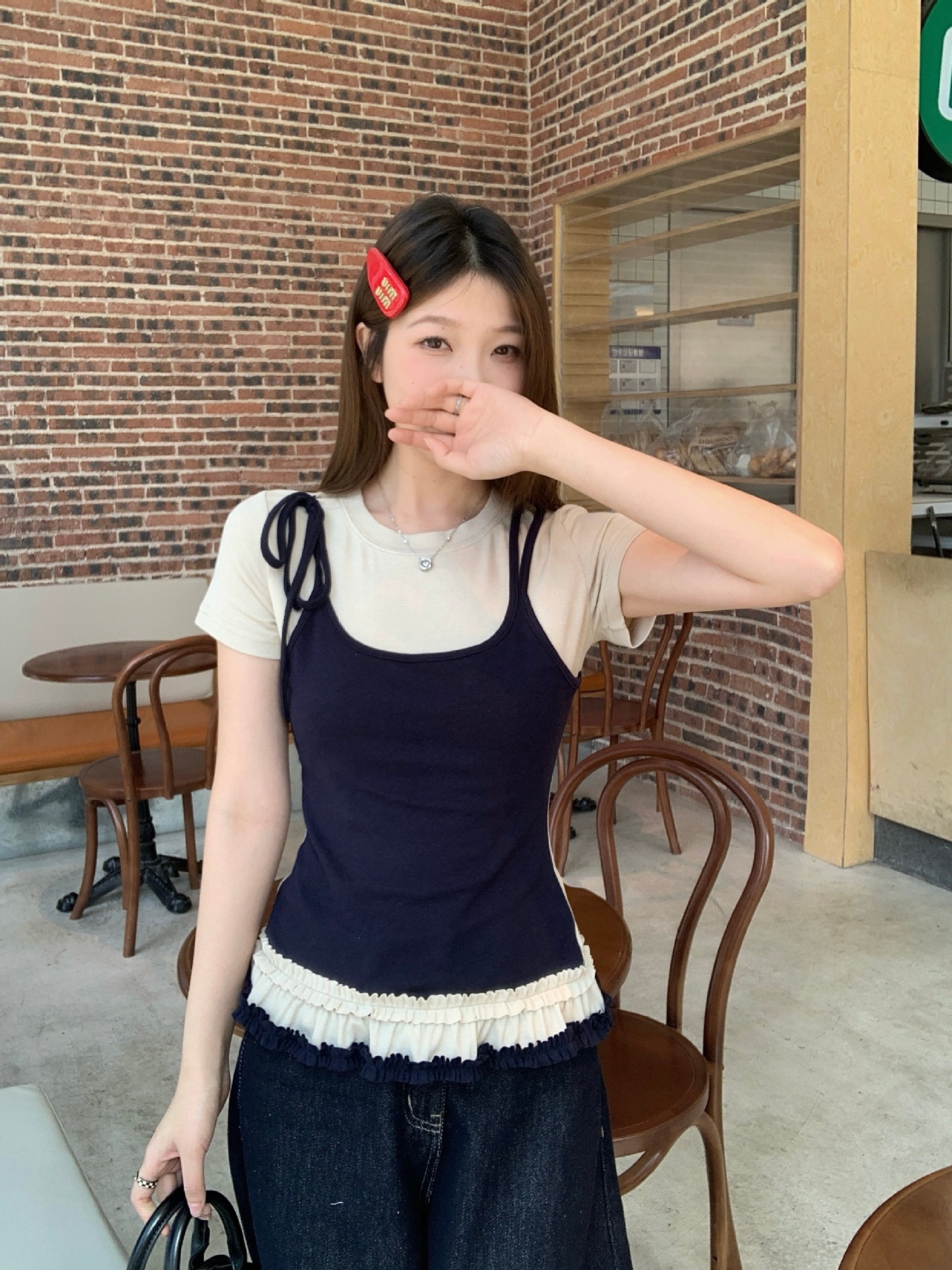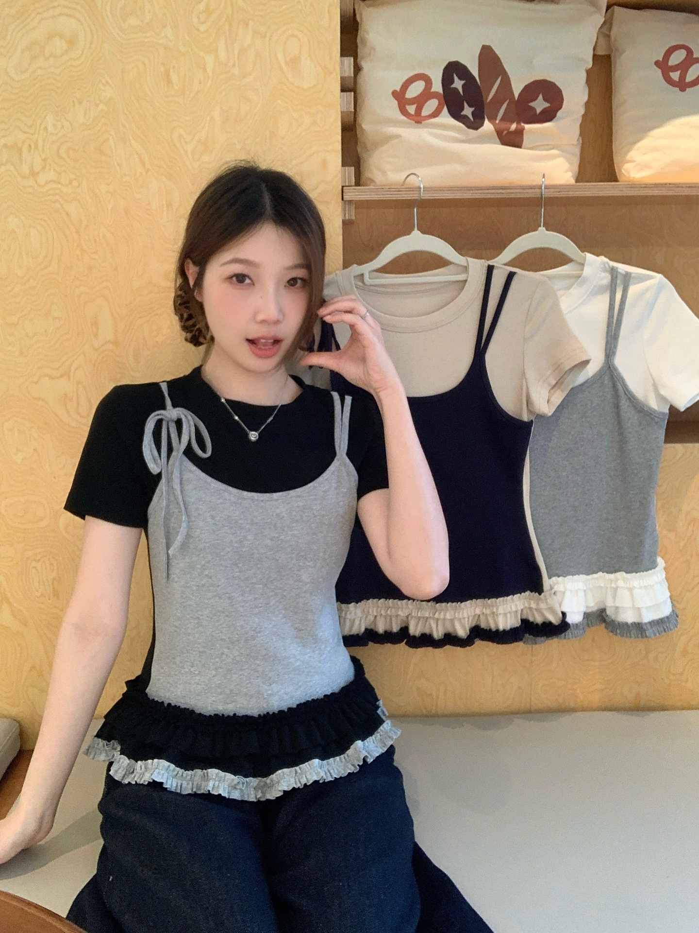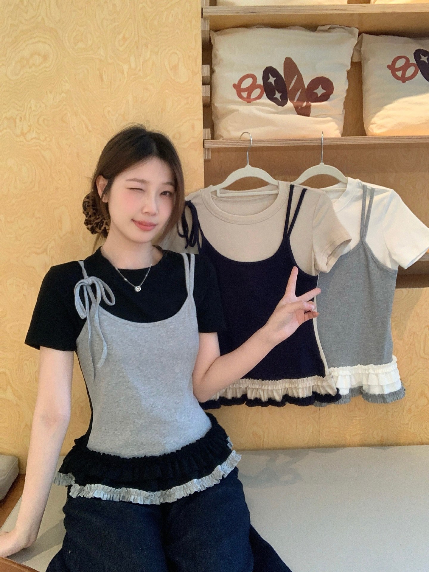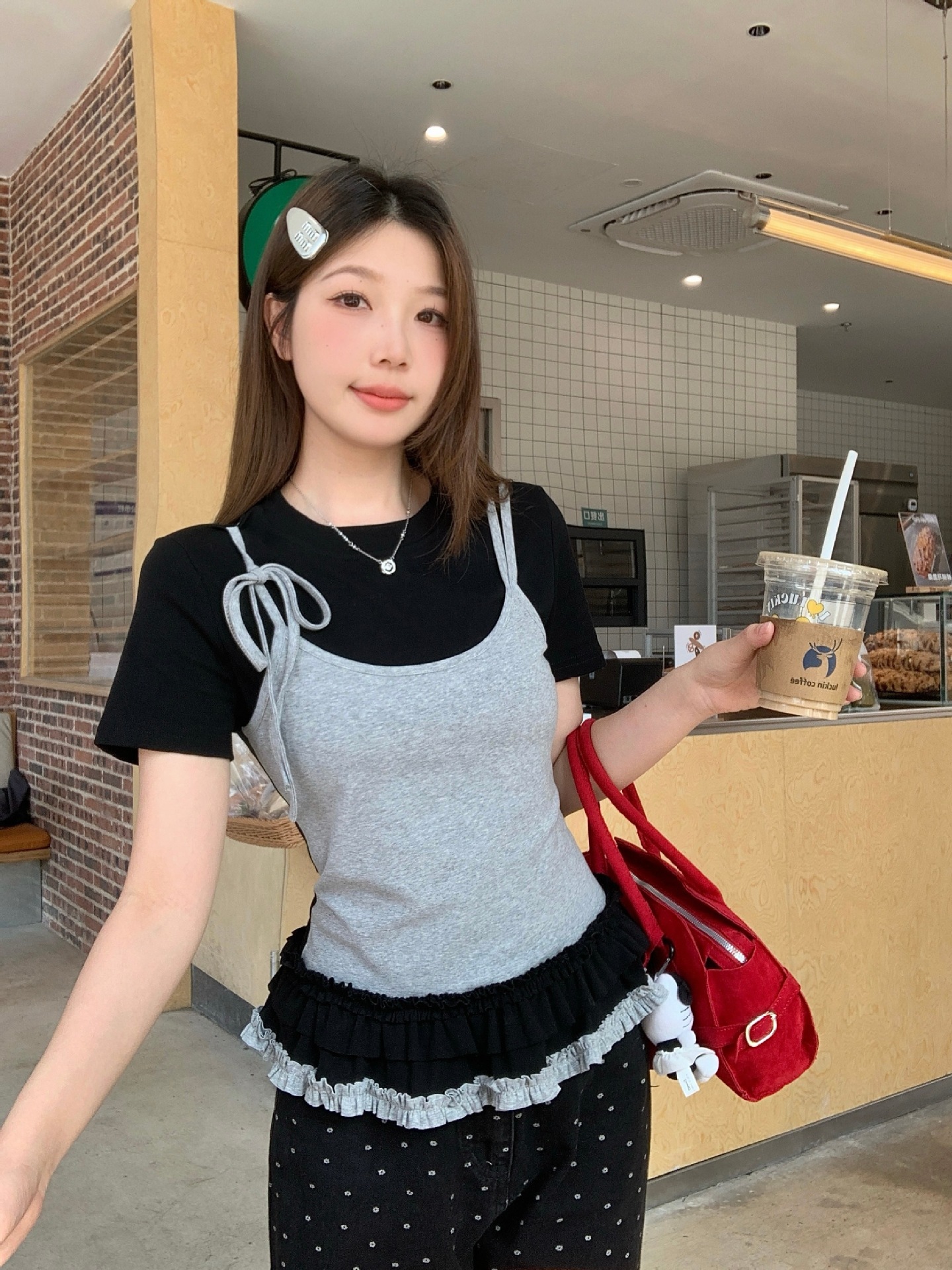 MR 【3色】韓国風フェイクツーピースサスペンダー継ぎ半袖夏甘辛ニッチ木耳トップス