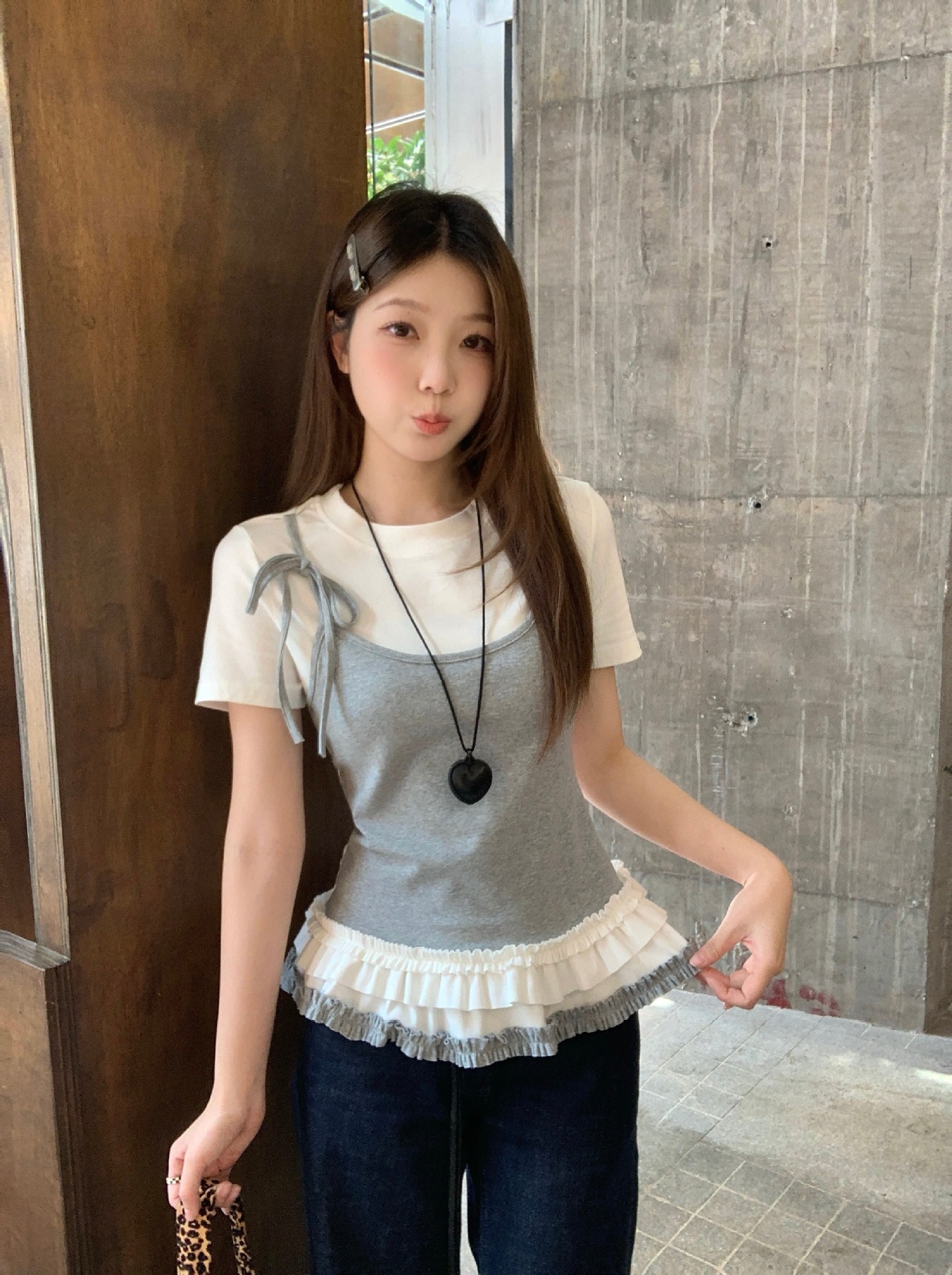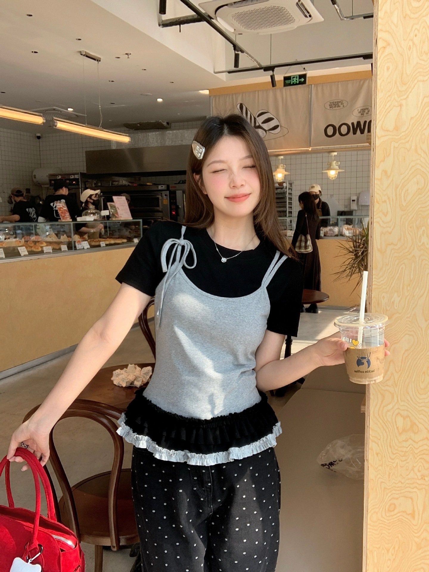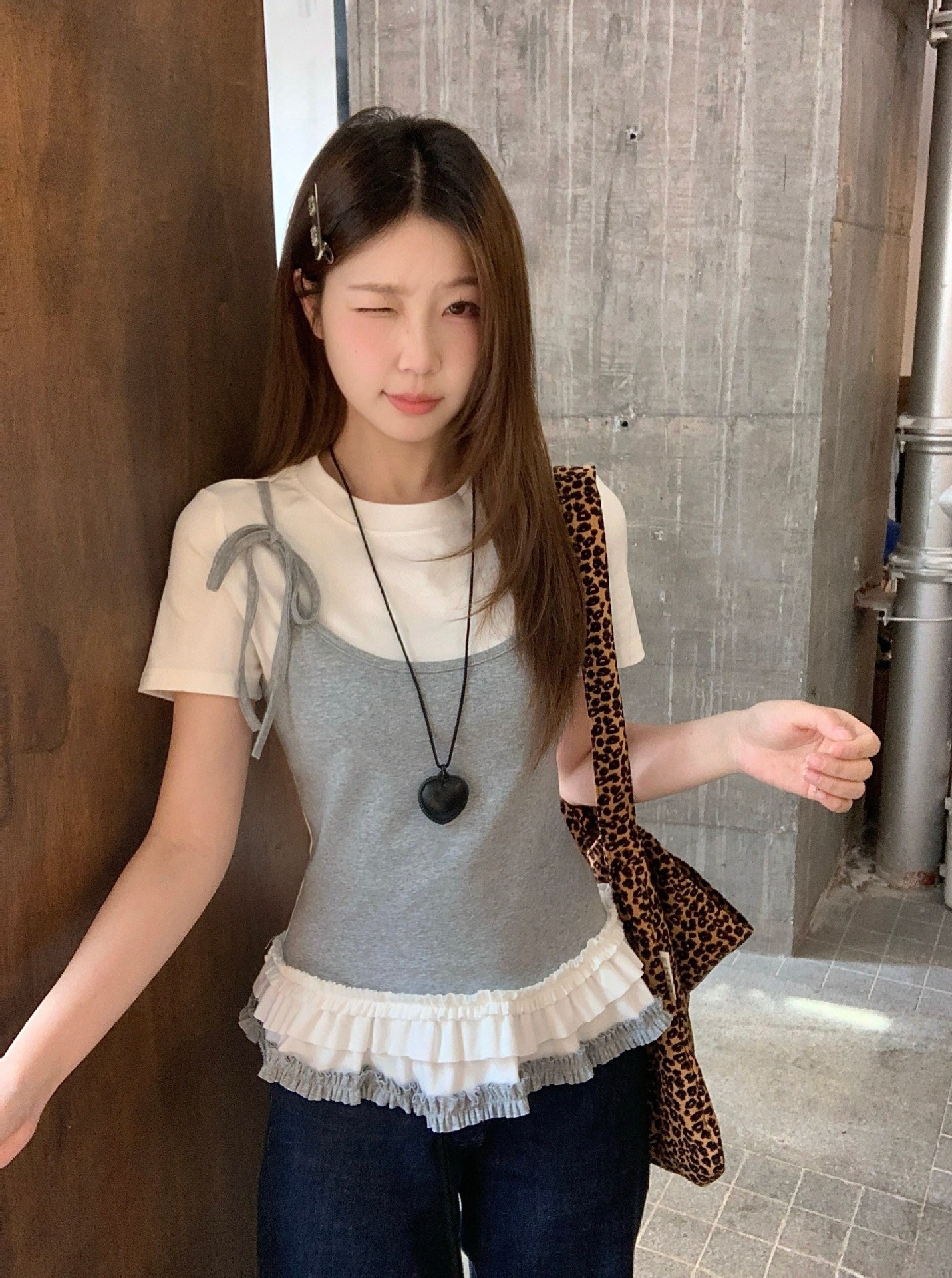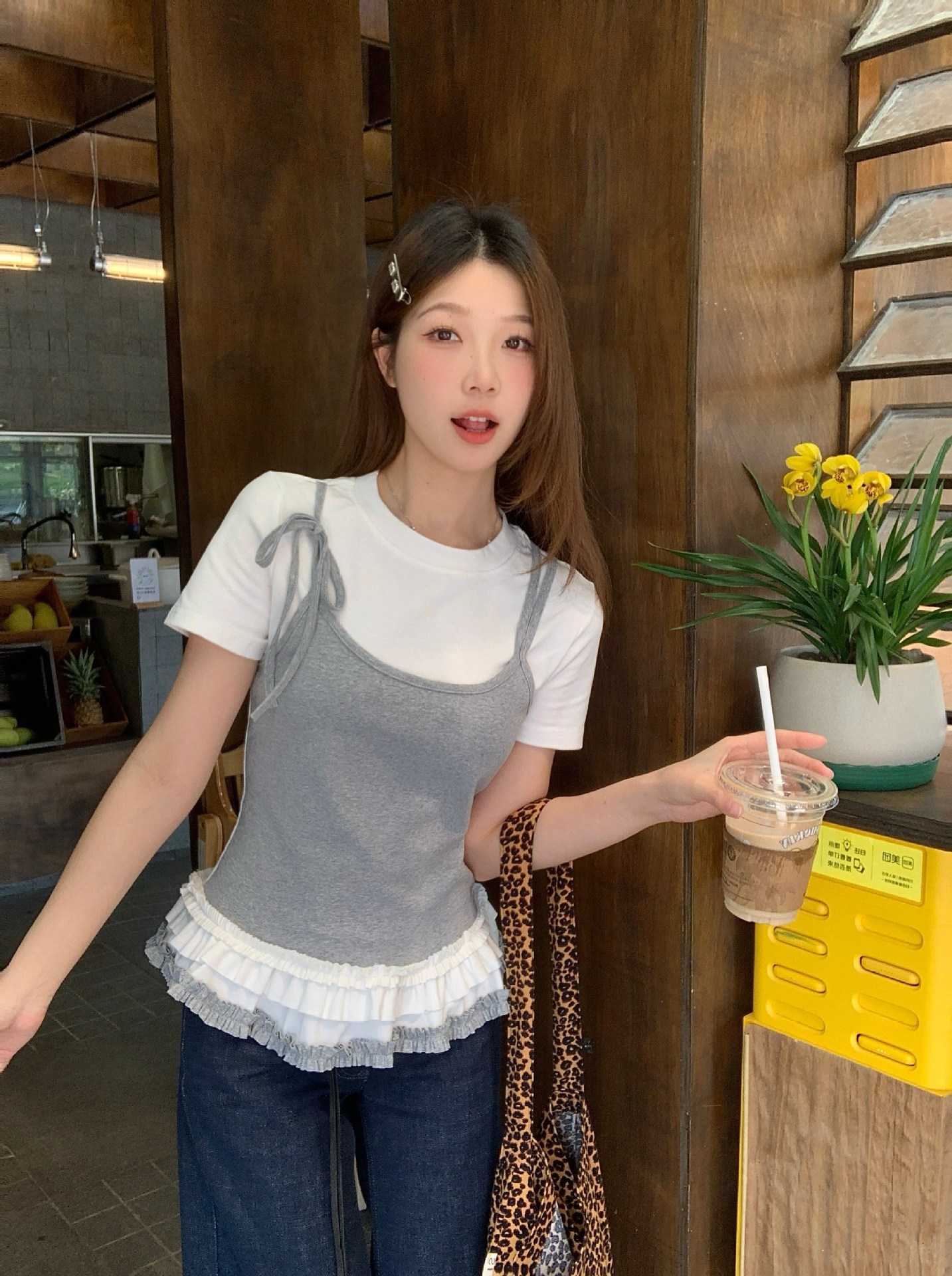 MR 【3色】韓国風フェイクツーピースサスペンダー継ぎ半袖夏甘辛ニッチ木耳トップス