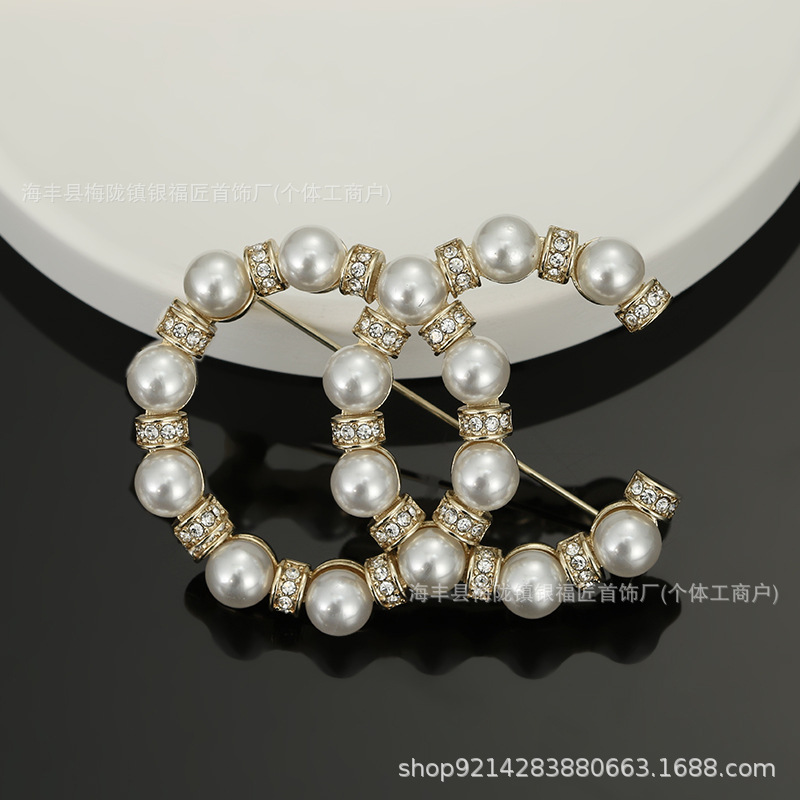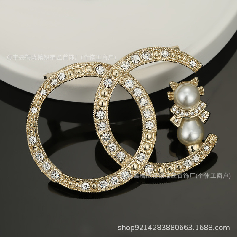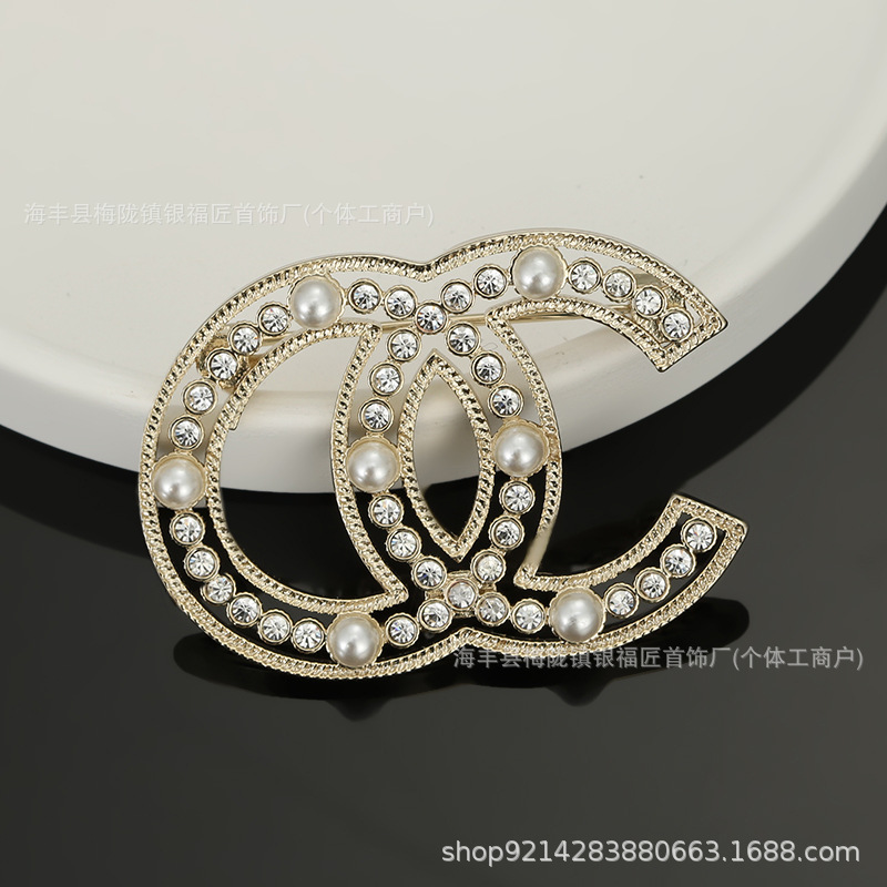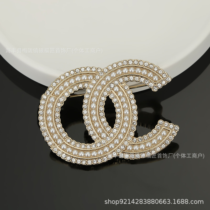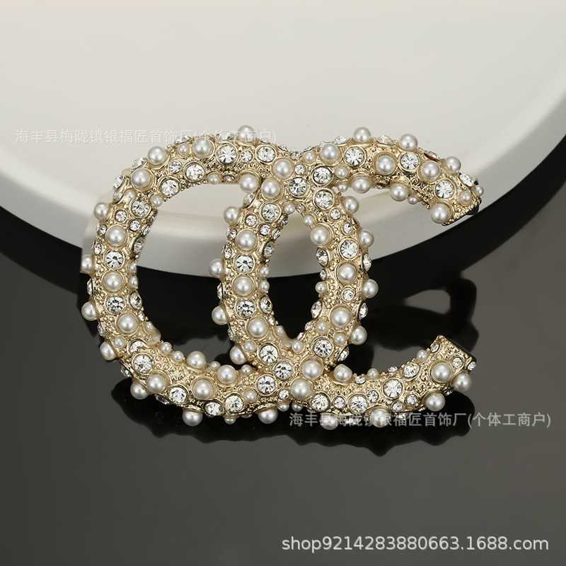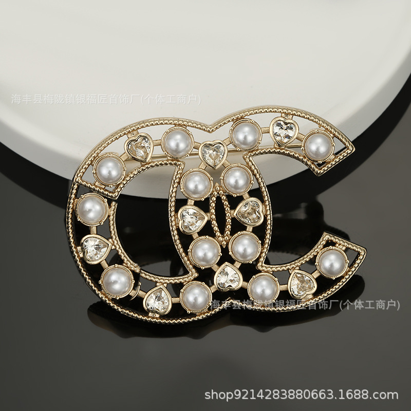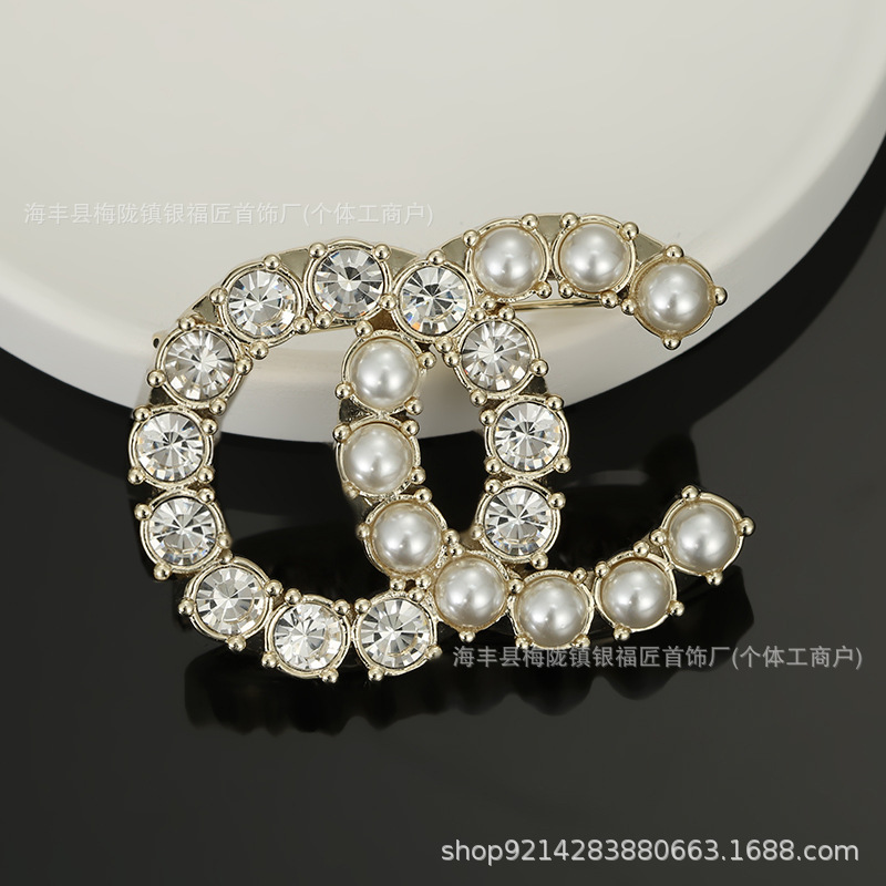 香家ダブルCフルダイヤモンド中空ブローチ、スクエアダイヤモンドパールピン、香奶奶椿花胸飾り、欧米風ダブルCデザイン