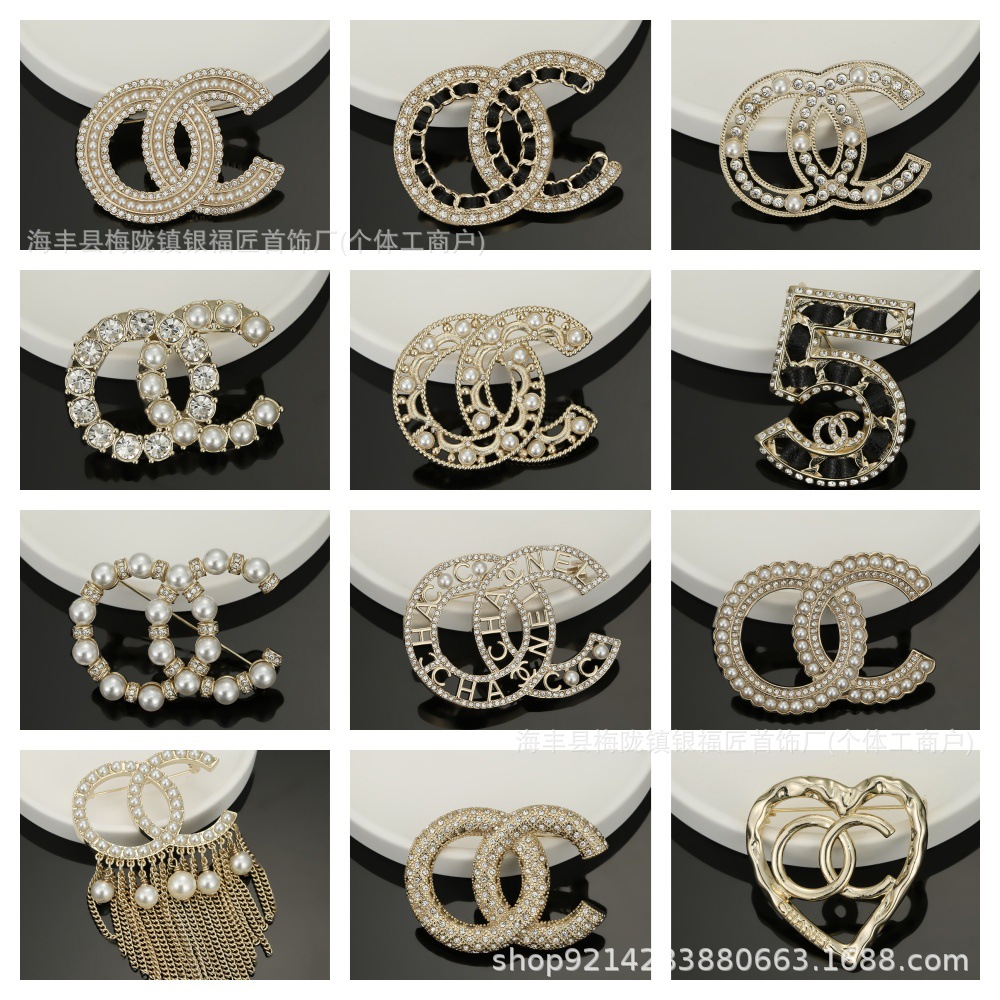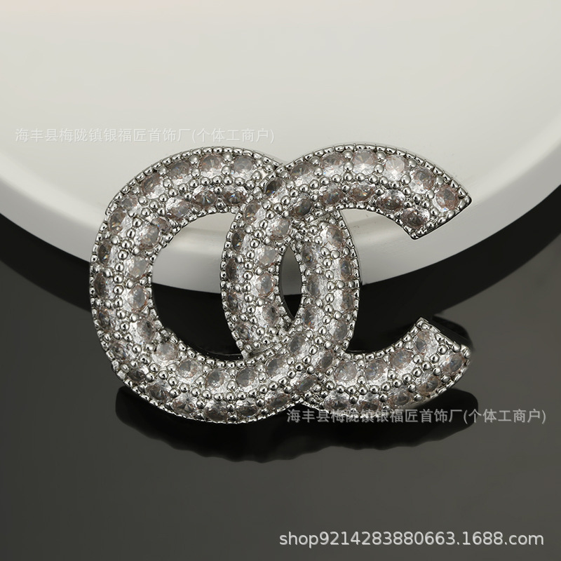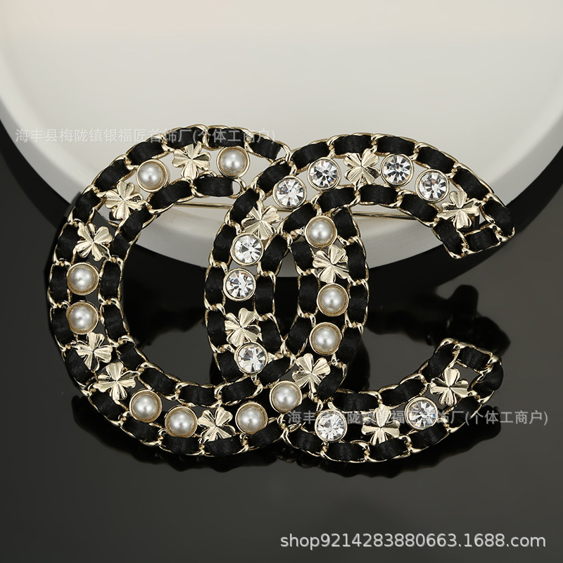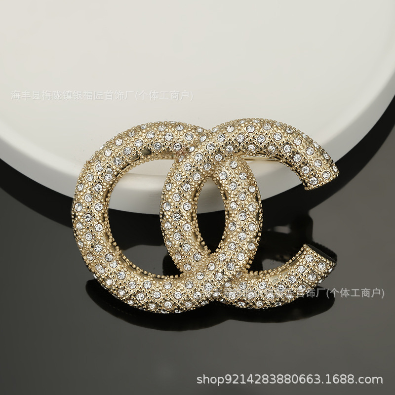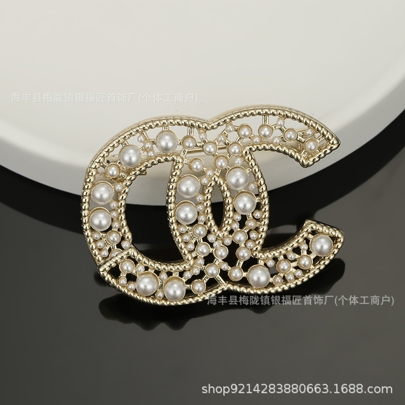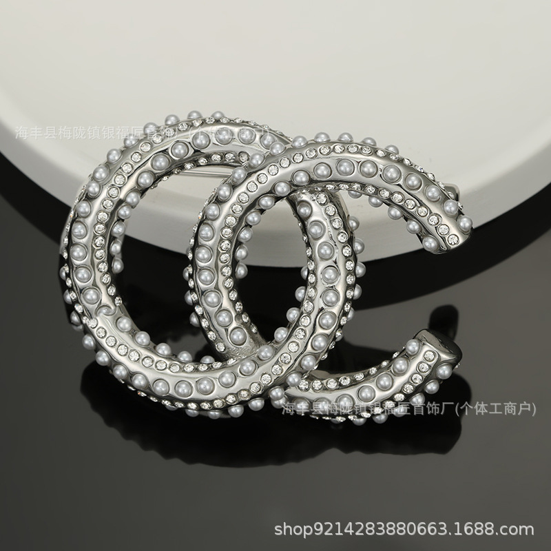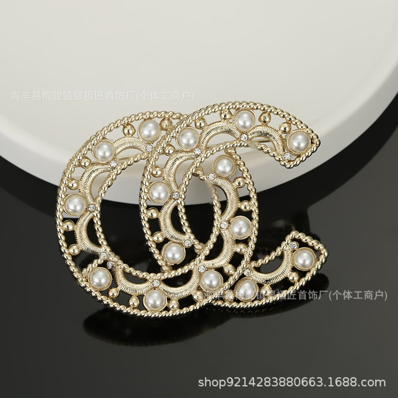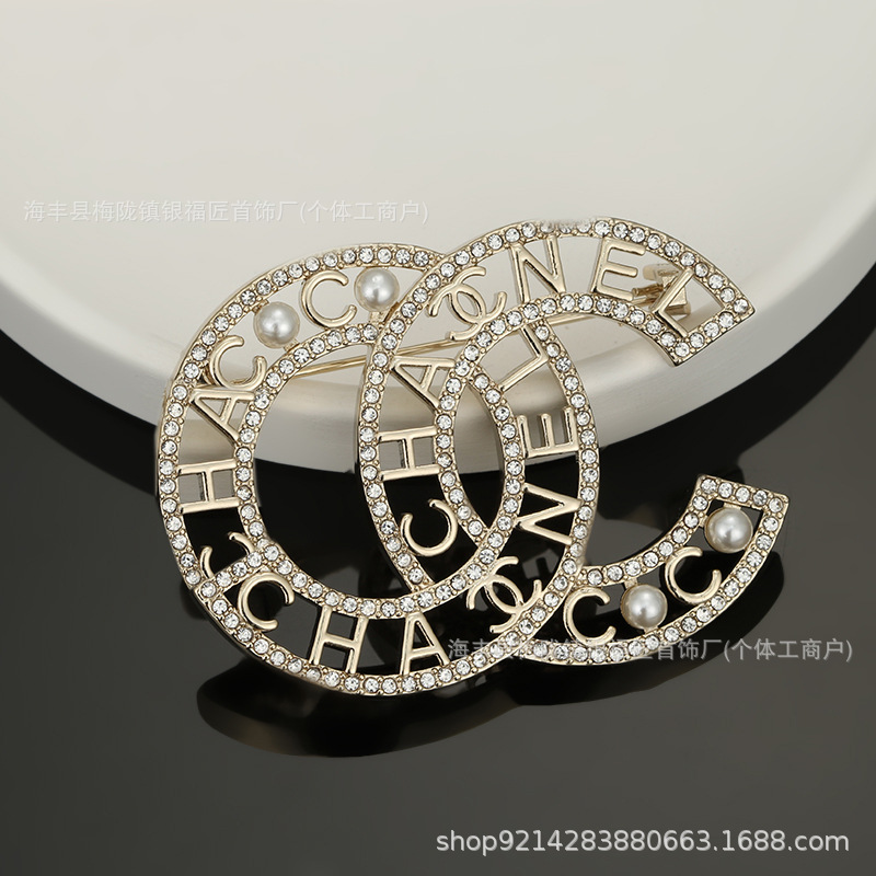 香家ダブルCフルダイヤモンド中空ブローチ、スクエアダイヤモンドパールピン、香奶奶椿花胸飾り、欧米風ダブルCデザイン