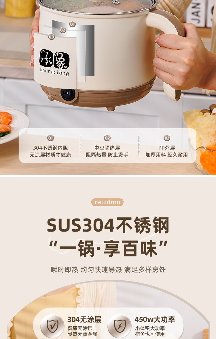 304 ステンレス鋼のベビーおかゆ補助鍋多機能蒸しと調理オールインワン寮プラグインインスタントラーメン電気調理器 2 人用