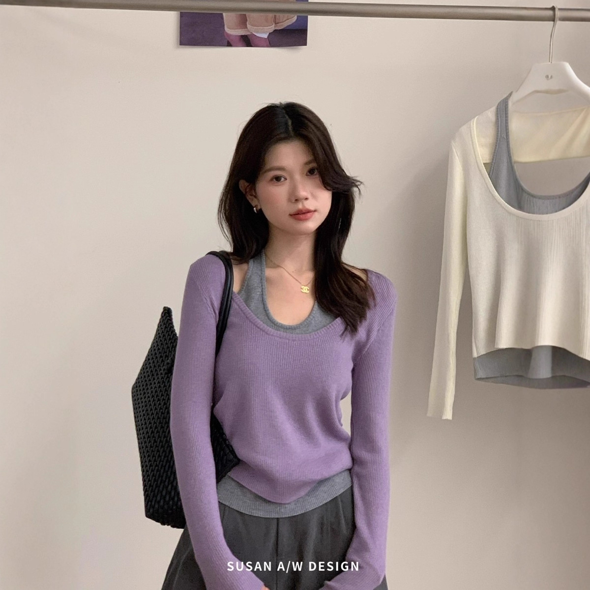 韩版简约假两件拼接挂脖针织衫女秋季2025新款显瘦别致百搭上衣潮