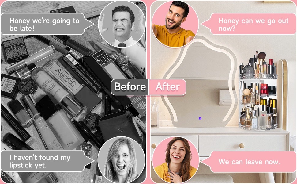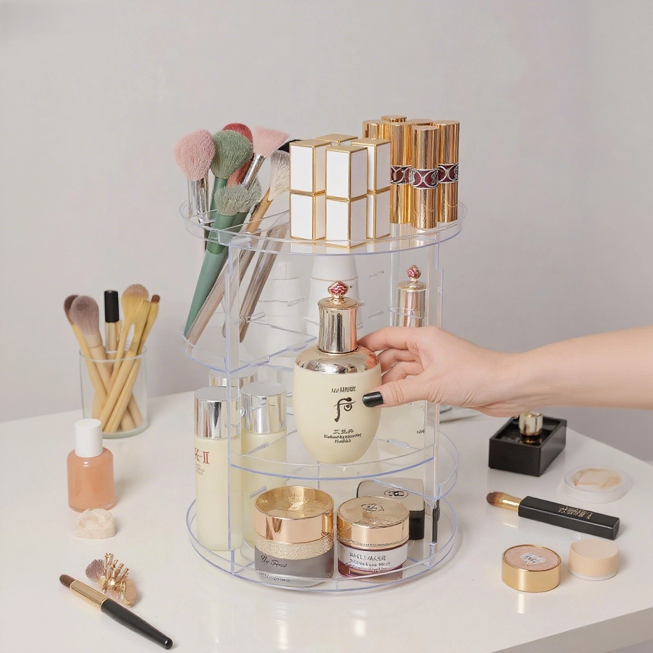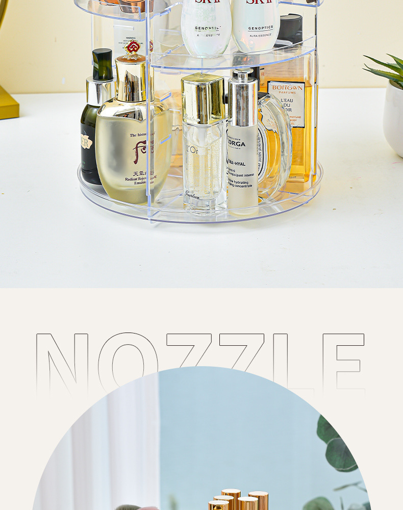 回転化粧品収納ボックス、透明スキンケア製品、調節可能な収納ラック、アイブロウペンシル、口紅、ジュエリー収納ラック