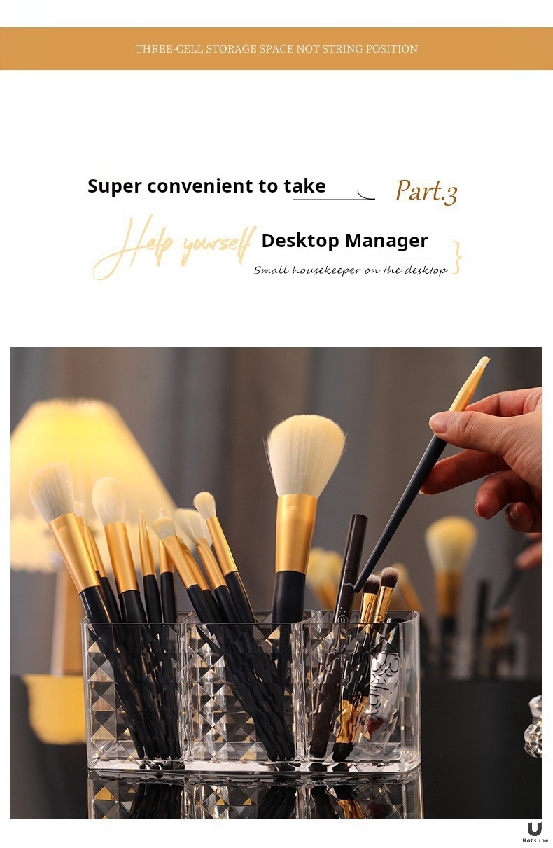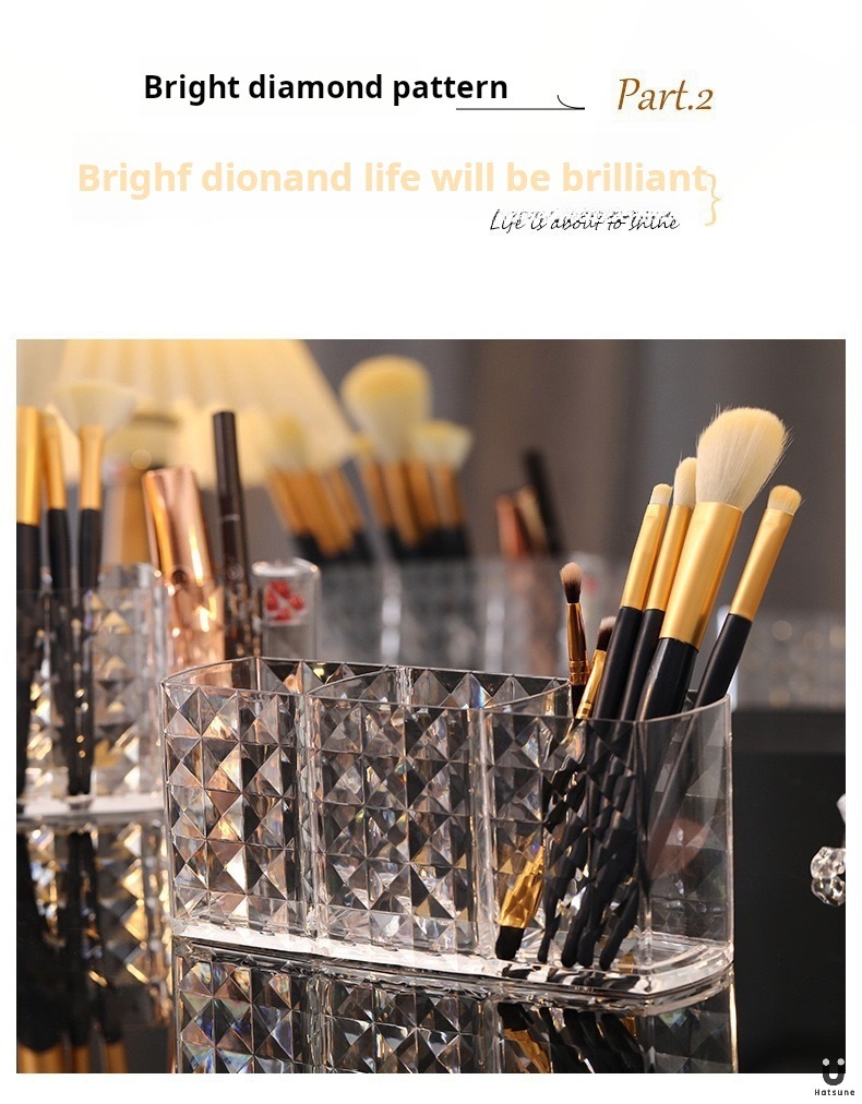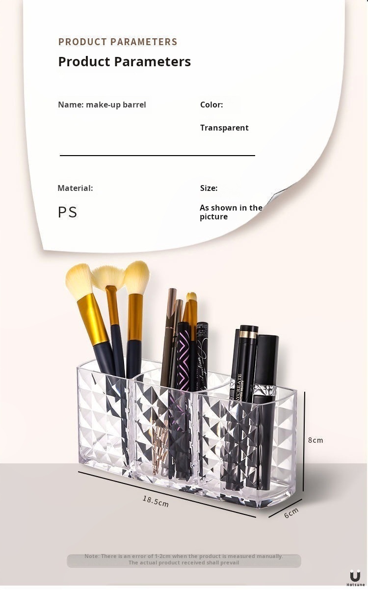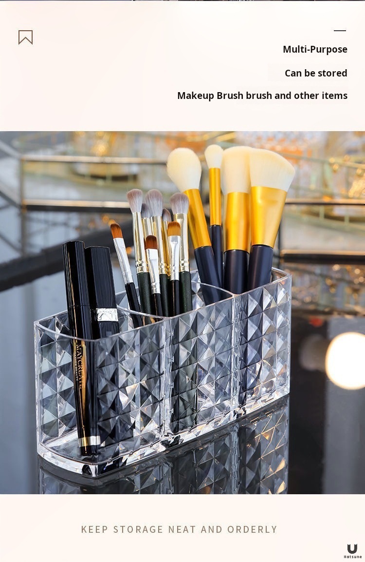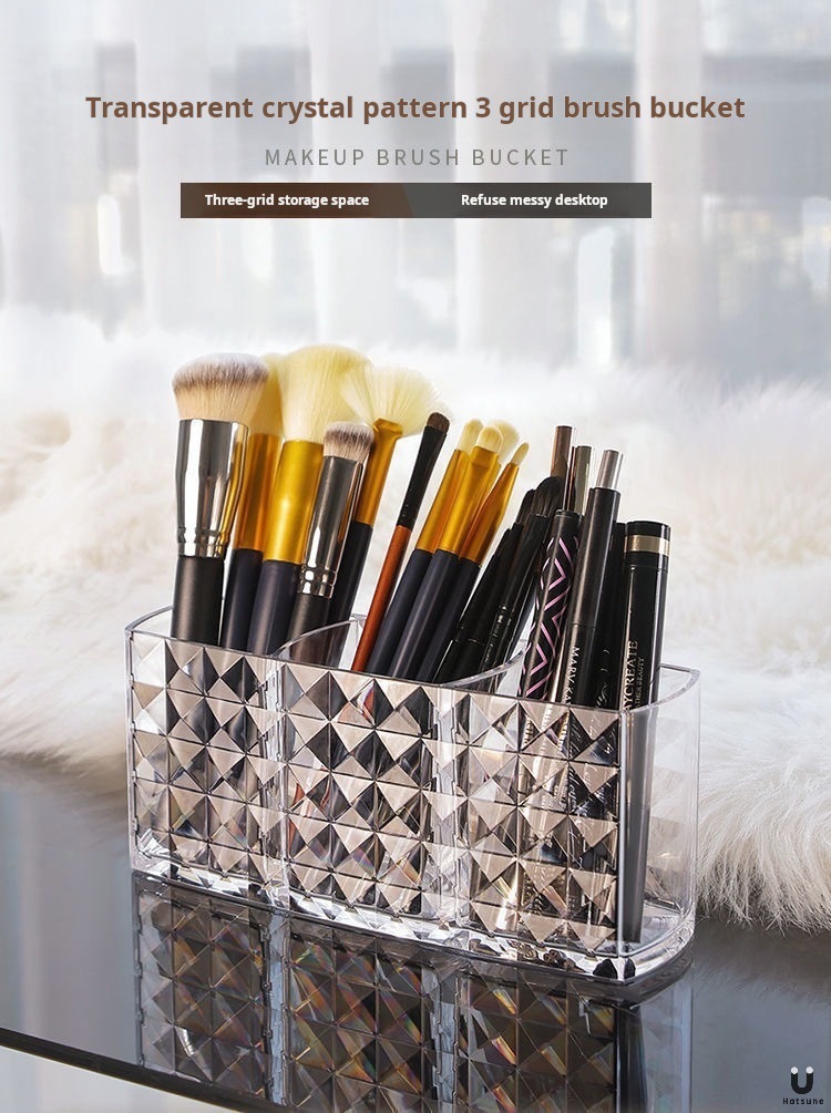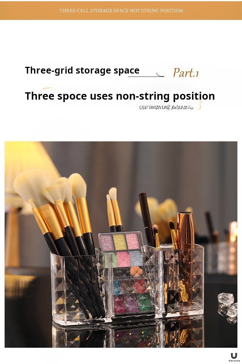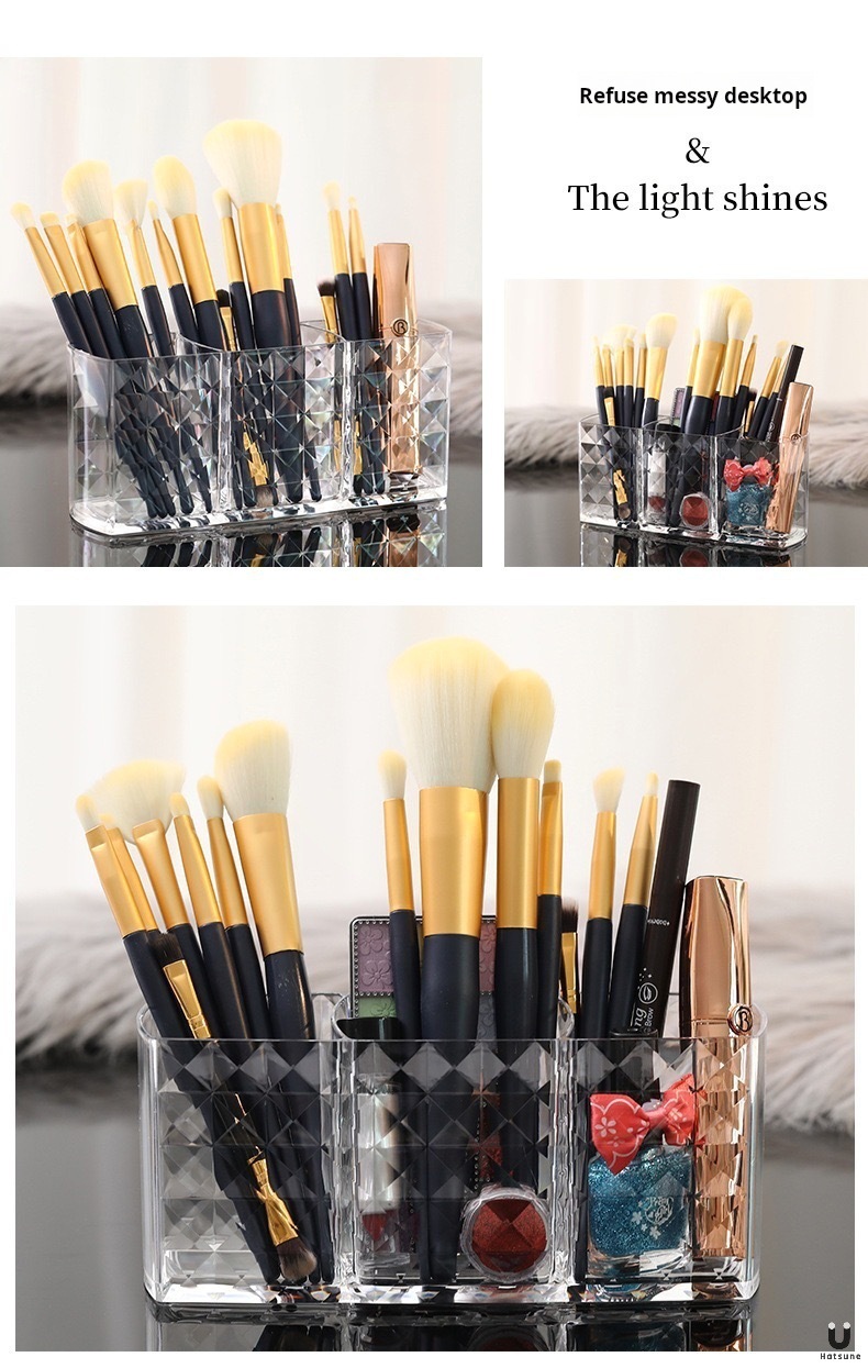 ドリルの紋様の3格のアクリルの透明な筆の筒の化粧は筒のアイデアの個性のデスクトップの眉の筆の口紅の収納箱をこすります。