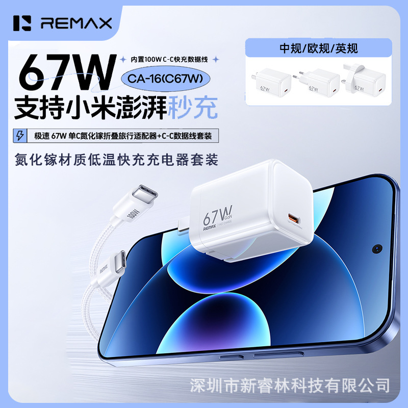 remax睿量手机适配器氮化镓材质67W快充type-c接口手机充电器套装