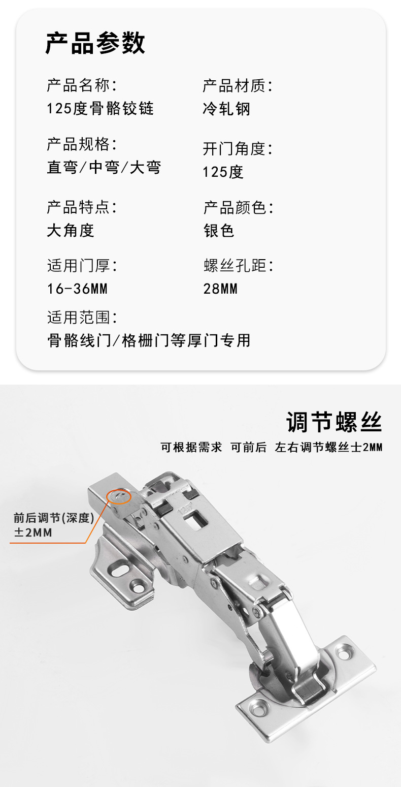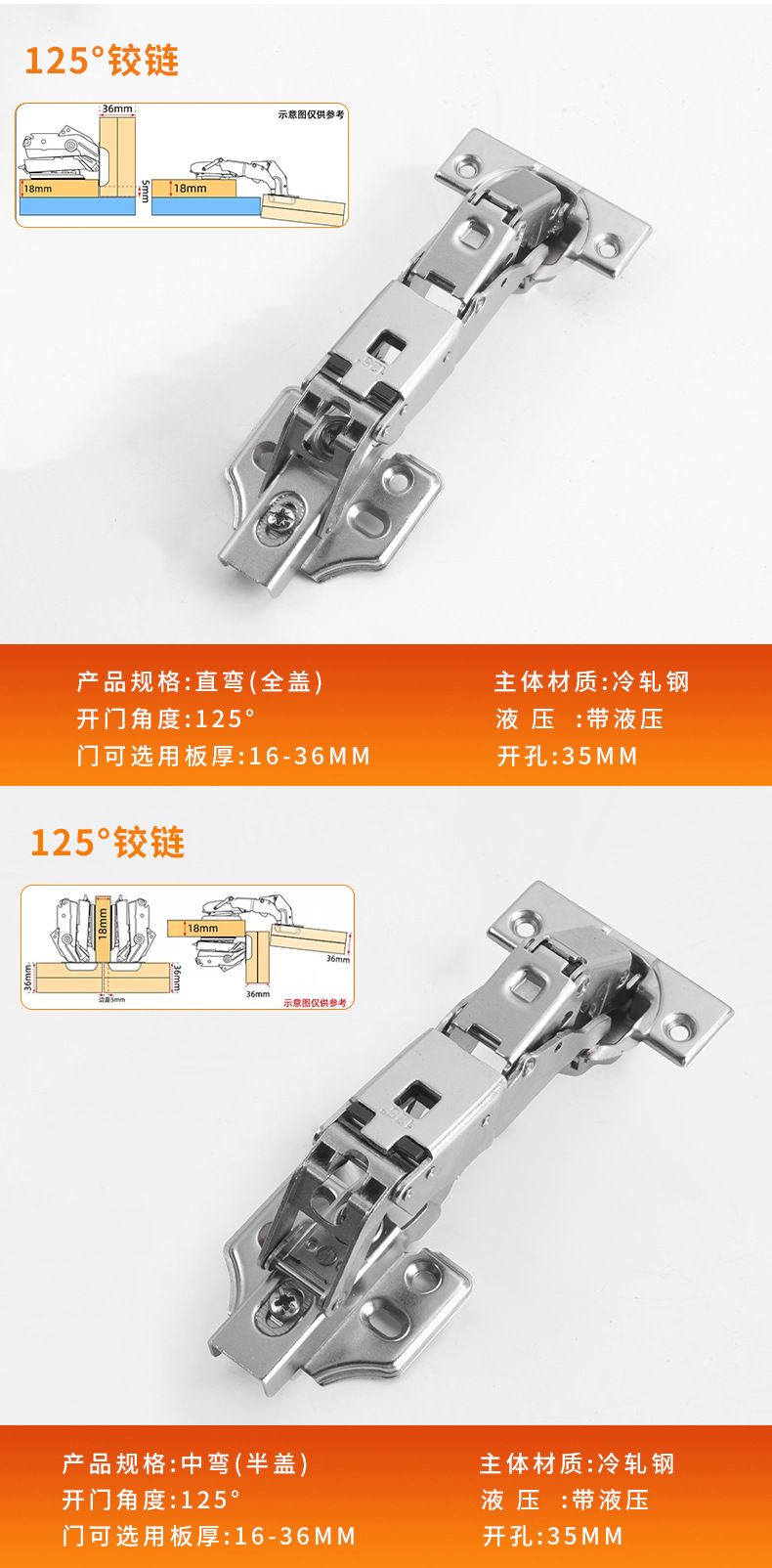 钛金125度骨骼线柜门阻尼液压铰链格栅门30mm36mm厚门大角度合页