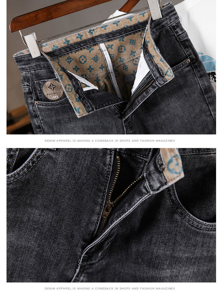高級男性ジーパン春秋新作百合ファッション弾力小直筒灰皿プリント長ズボン水洗い