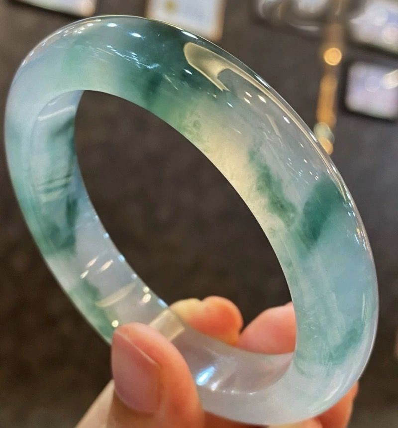 天然新疆天山翡翠ブレスレット雪翡翠氷もち種半山水染め花薄い丸棒翡翠ブレスレット女性用