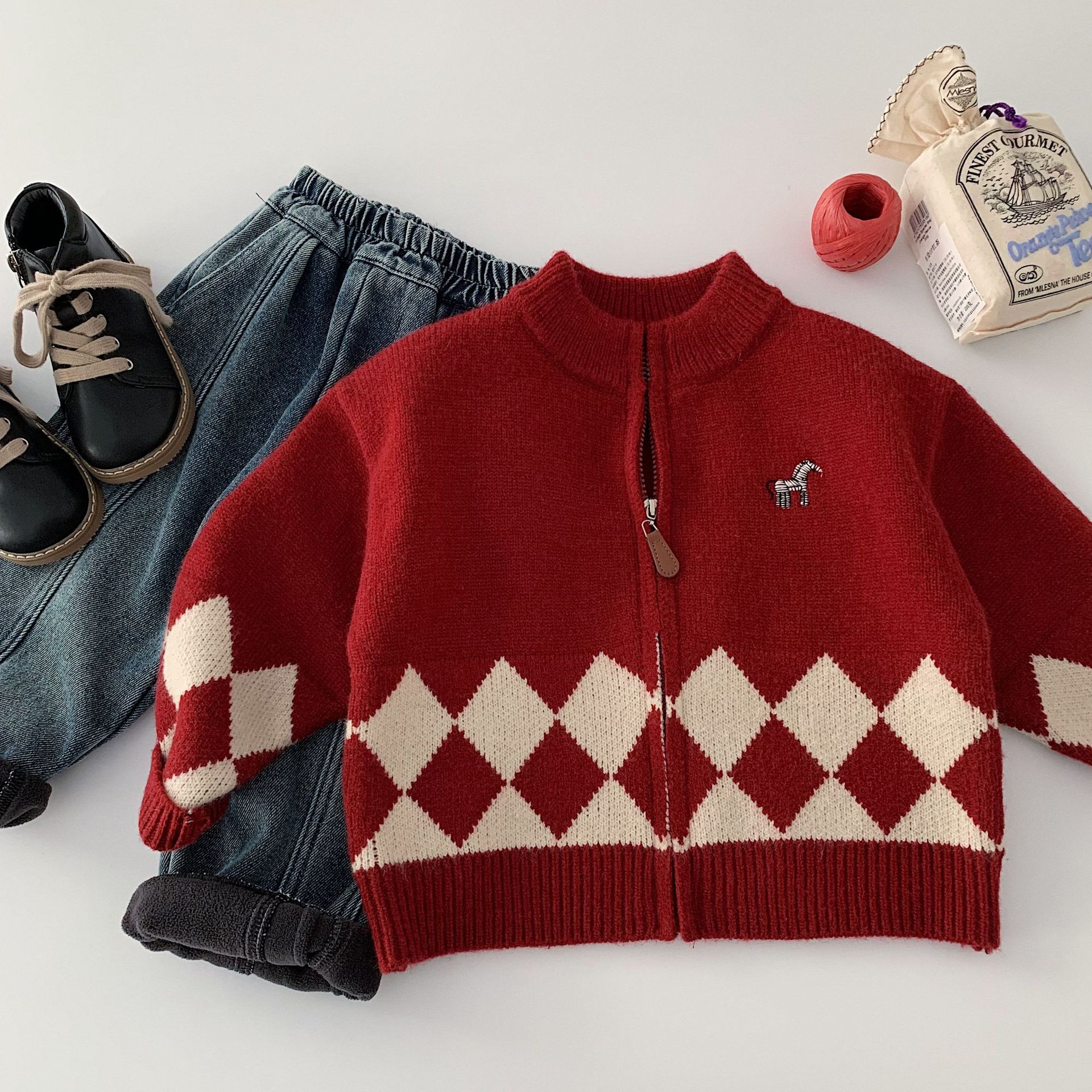 麦宝儿童针织开衫2026冬季新款韩版男童洋气毛衣小童红色年服冬装
