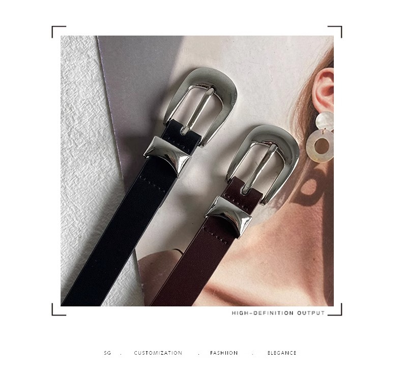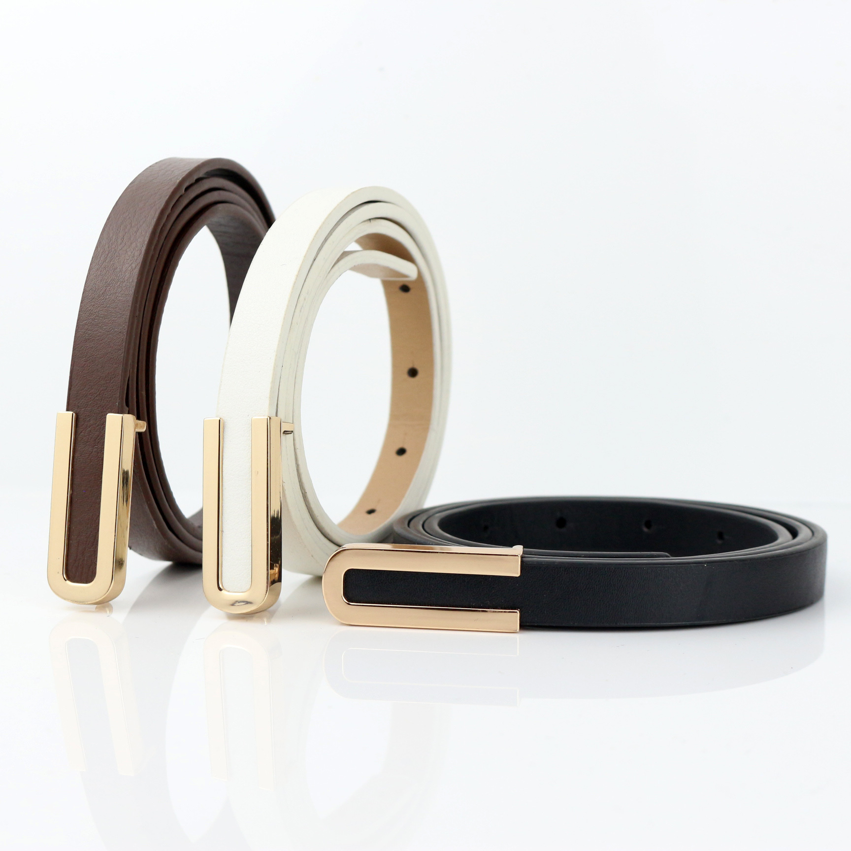 ファッションは黒い牛革の細いベルトの女性の装飾とワンピースのスカートのシンプルな韓国版スーツの白いベルトを合わせます。