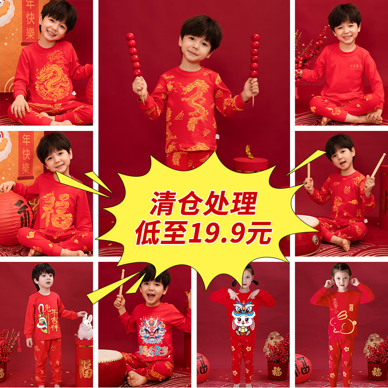 2026新款马年儿童本命年秋衣秋裤纯棉大红色女男童内衣套装中大童