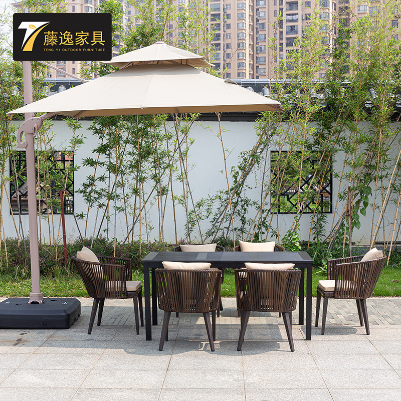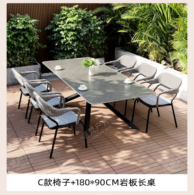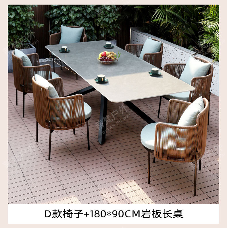 屋外テーブルと椅子、中庭ガーデンライト高級ダイニングテーブルと椅子の組み合わせ、ヴィラ屋外テラスバルコニー織り岩板テーブルと椅子
