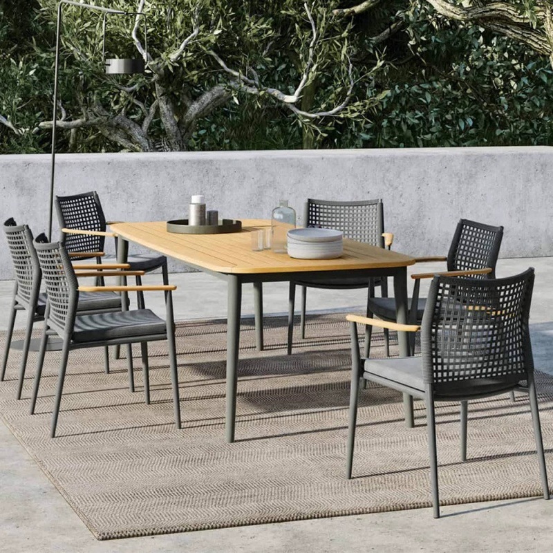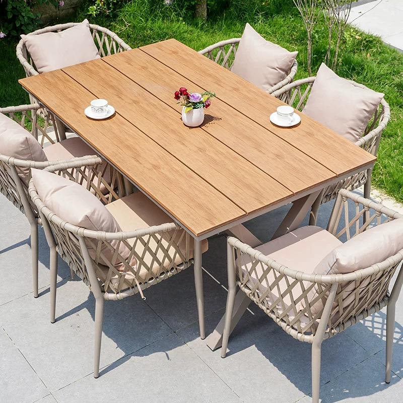 屋外チークテーブルと椅子、ヴィラ中庭ガーデンアルミ合金ダイニングテーブルと椅子、ロープ編み椅子、防水日焼け止めバルコニーティーテーブルと椅子