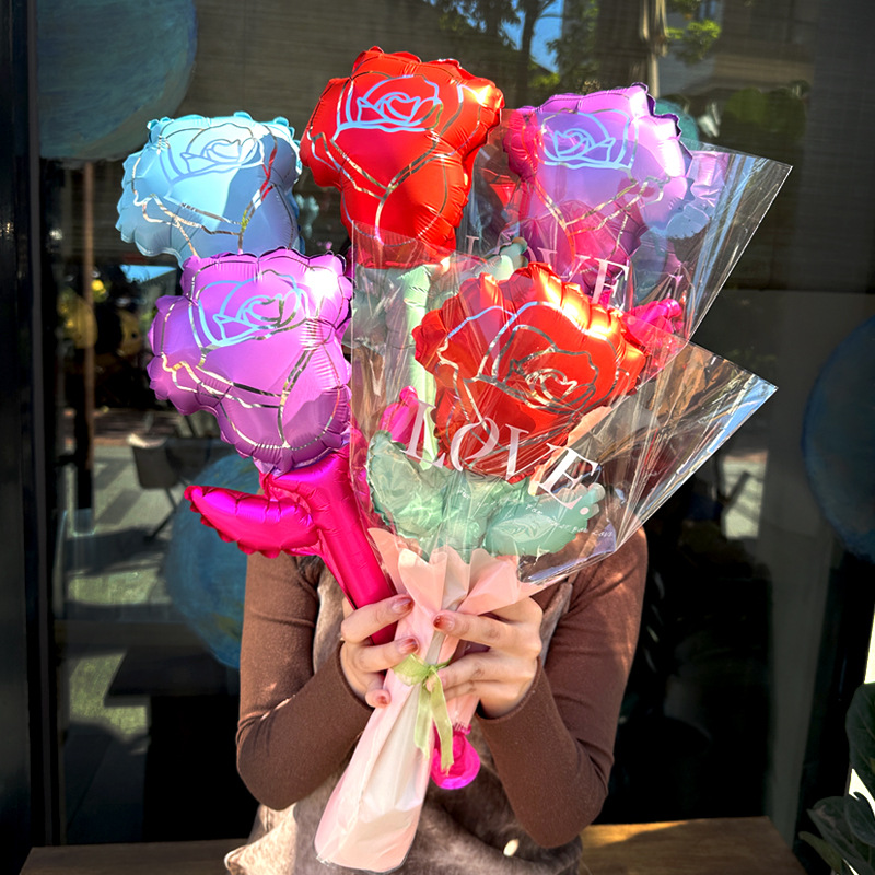 バラの花を手に持って母の日のバレンタインデーの風船の贈り物をします。
