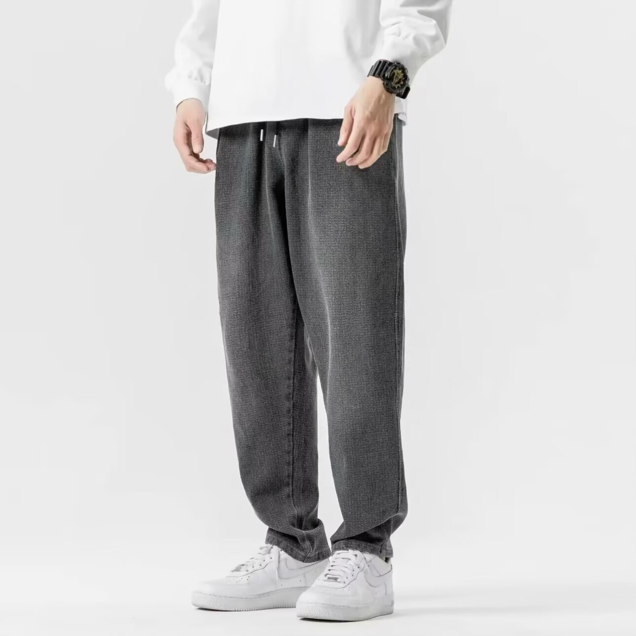 黒ジーンズ男秋水洗いレトロゆるいストレートパンツ高街ファッションシンプルデザイン長ズボン
