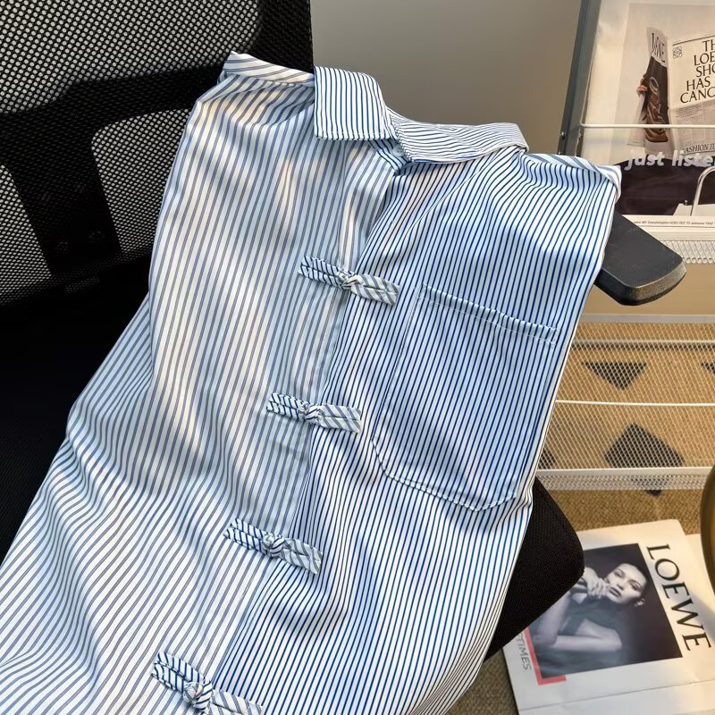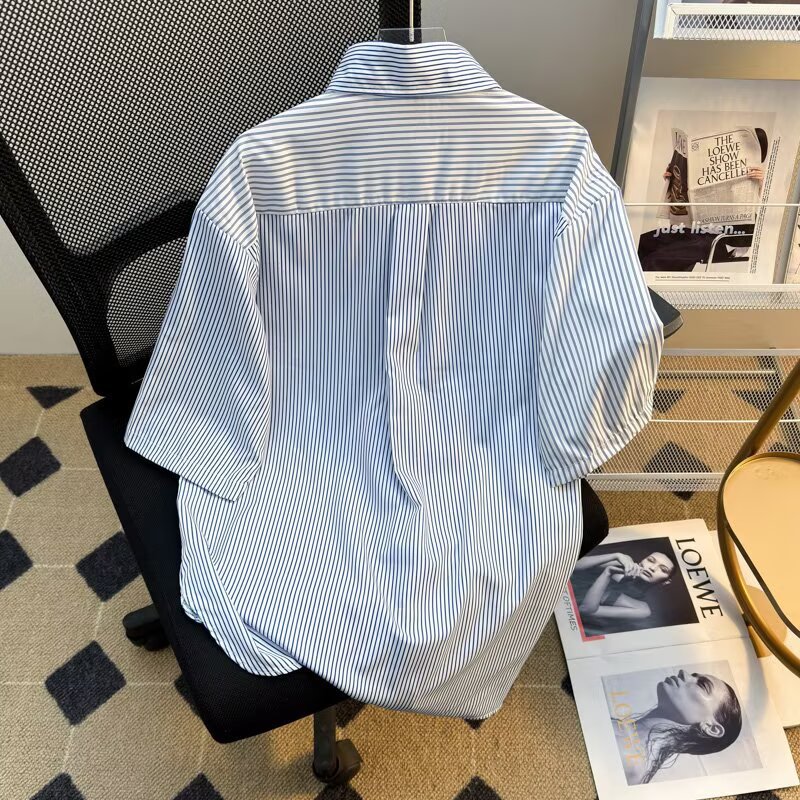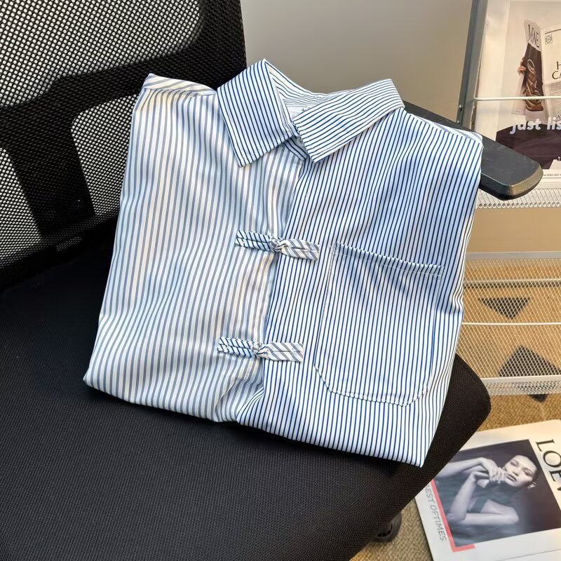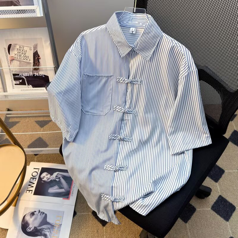 新中式拼接条纹中国风盘扣衬衫男装潮流2025夏百搭口袋衬衣短袖
