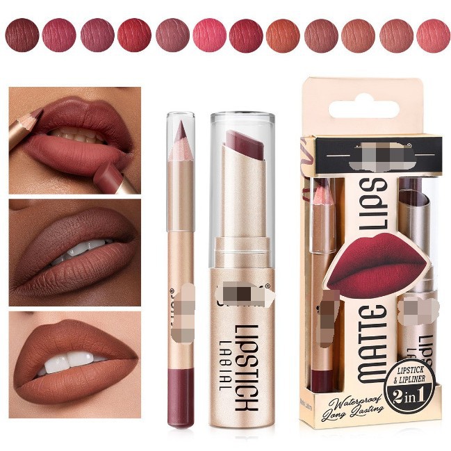 跨境亚马逊唇线笔带不沾杯持久防水哑光唇膏口红套装12色