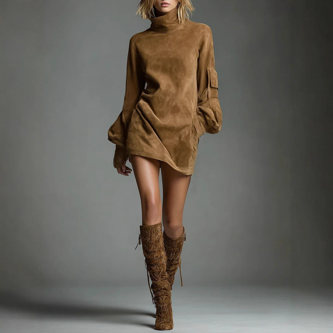 2025欧美跨境高端女装复古翻领仿麂皮短款连衣裙秋冬新款长袖短裙