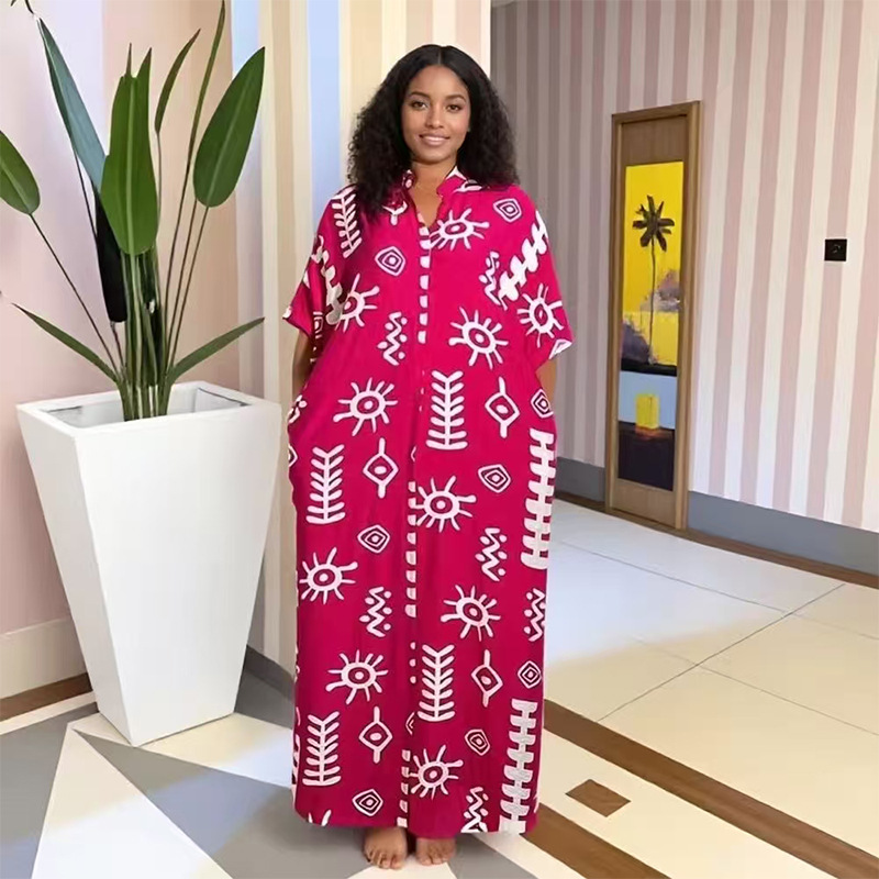 欧美跨境现货女装2025新款时尚印花宽松大码连衣裙开衫印花长裙
