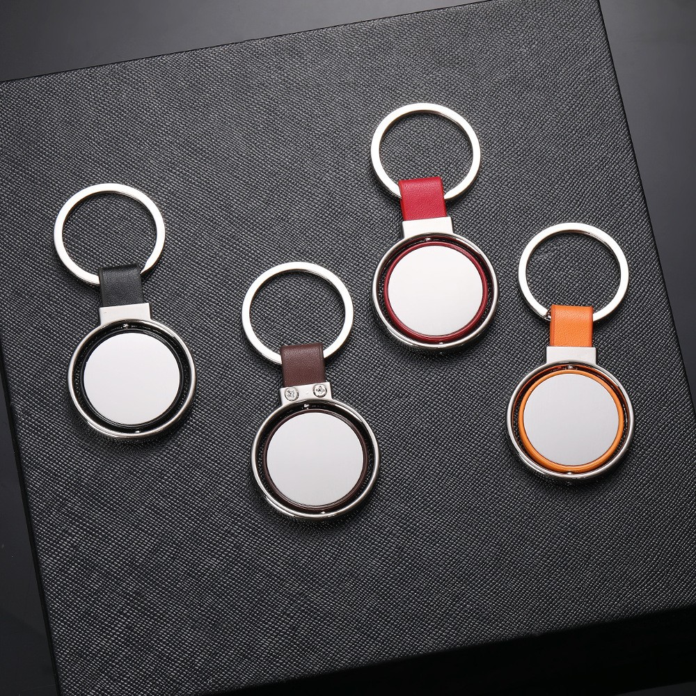 国境を越えて人気の丸型メタル回転キーホルダー、プロモーション用PUレザー回転式、ロゴ入りクリエイティブ