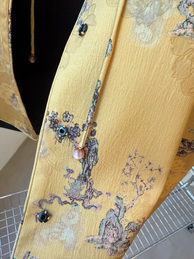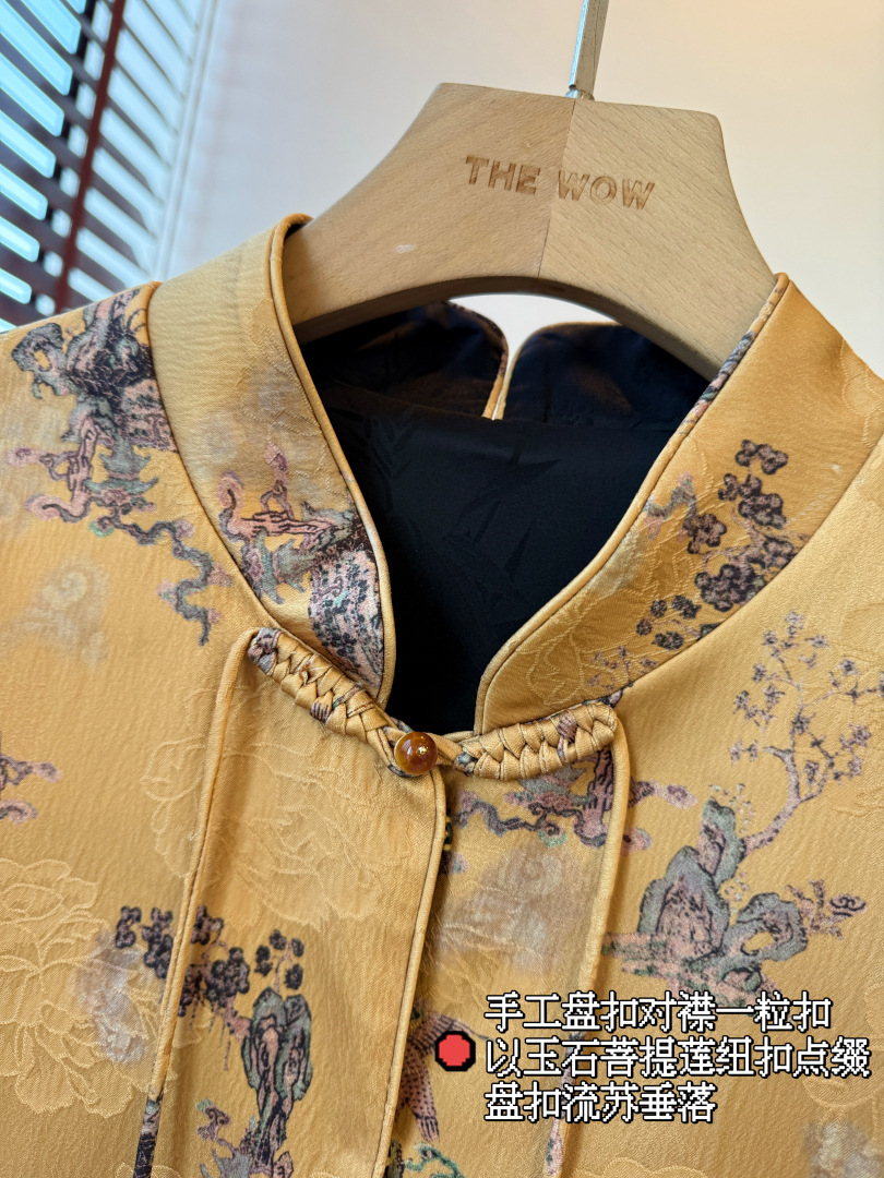 手工盘扣对襟一粒扣,以玉石菩提莲纽扣点缀'盘扣流苏垂落,